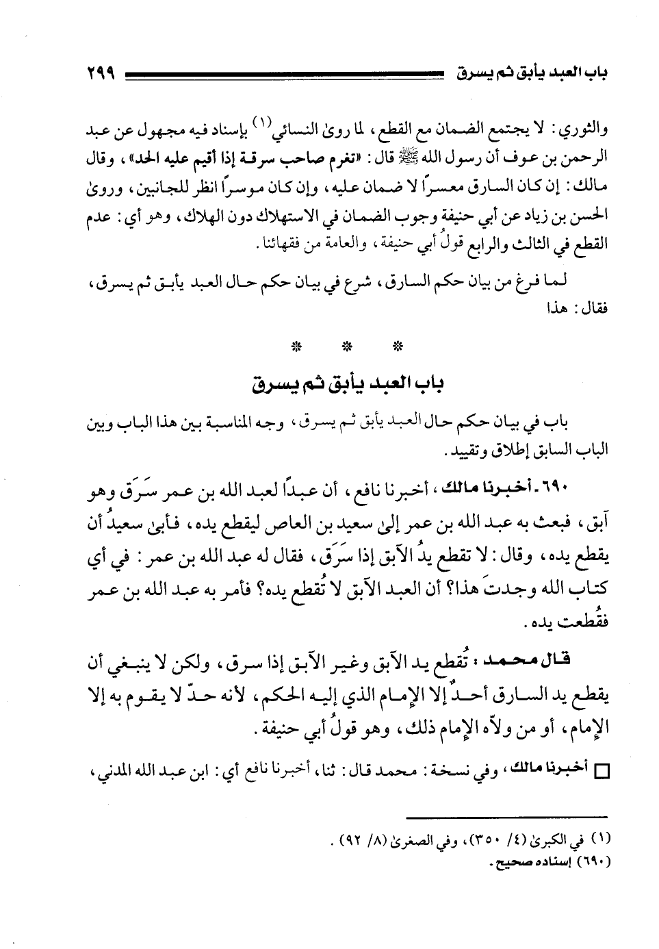 690 - أخبرنا مالك، أخبرنا شافع، أن عبدًا لعبد الله بن عمر سَرَق وهو آبق، فبعث به عبد الله بن عمر إلى سعيد بن العاص ليقطع يده، فأبى سعيدُ أن يقطع يده، وقال: لا تقطع يدُ الآبق إذا سَرَق، فقال له عبد الله بن عمر: في أي كتاب الله وجدتَ هذا؟ أن العبد الآبق لا تُقطع يده؟ فأمر به عبد الله بن عمر فقُطعت يده.