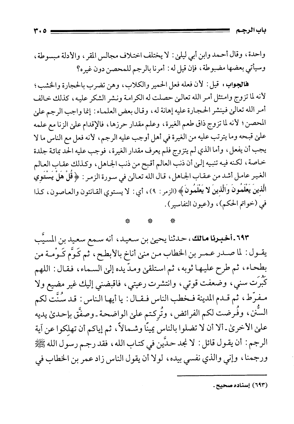 693 - أخبرنا مالك، حدثنا يحيى بن سعيد، أنه سمع سعيد بن المسيَّب يقول: لما صدر عمر بن الخطاب من منى أناخ بالأبطح، ثم كَوَّم كَوْمة من بطحاء، ثم طرح عليها ثوبه، ثم استلقى ومدّ يده إلى السماء، فقال: اللهم كَبُرَت سني، وضعفت قوتي، وانتشرت رعيتي، فاقبضني إليك غير مضيع ولا مفرّط، ثم قدم المدينة فخطب الناس فقال: يا أيها الناس: قد سُنَّت لكم السُّنن، وفُرضت لكم الفرائض، وتُرِكتم على الواضحة - وصفَّق بإحدى يديه على الأخرى - ألا أن لا تضلوا بالناس يمينًا وشمالًا، ثم إياكم أن تهلِكوا عن آية الرجم: أن يقول قائل: لا نجد حدَّين في كتاب الله، فقد رجم رسول الله - صلى الله عليه وسلم - ورجمنا، وإني والذي نفسي بيده، لولا أن يقول الناس زاد عمر بن الخطاب في