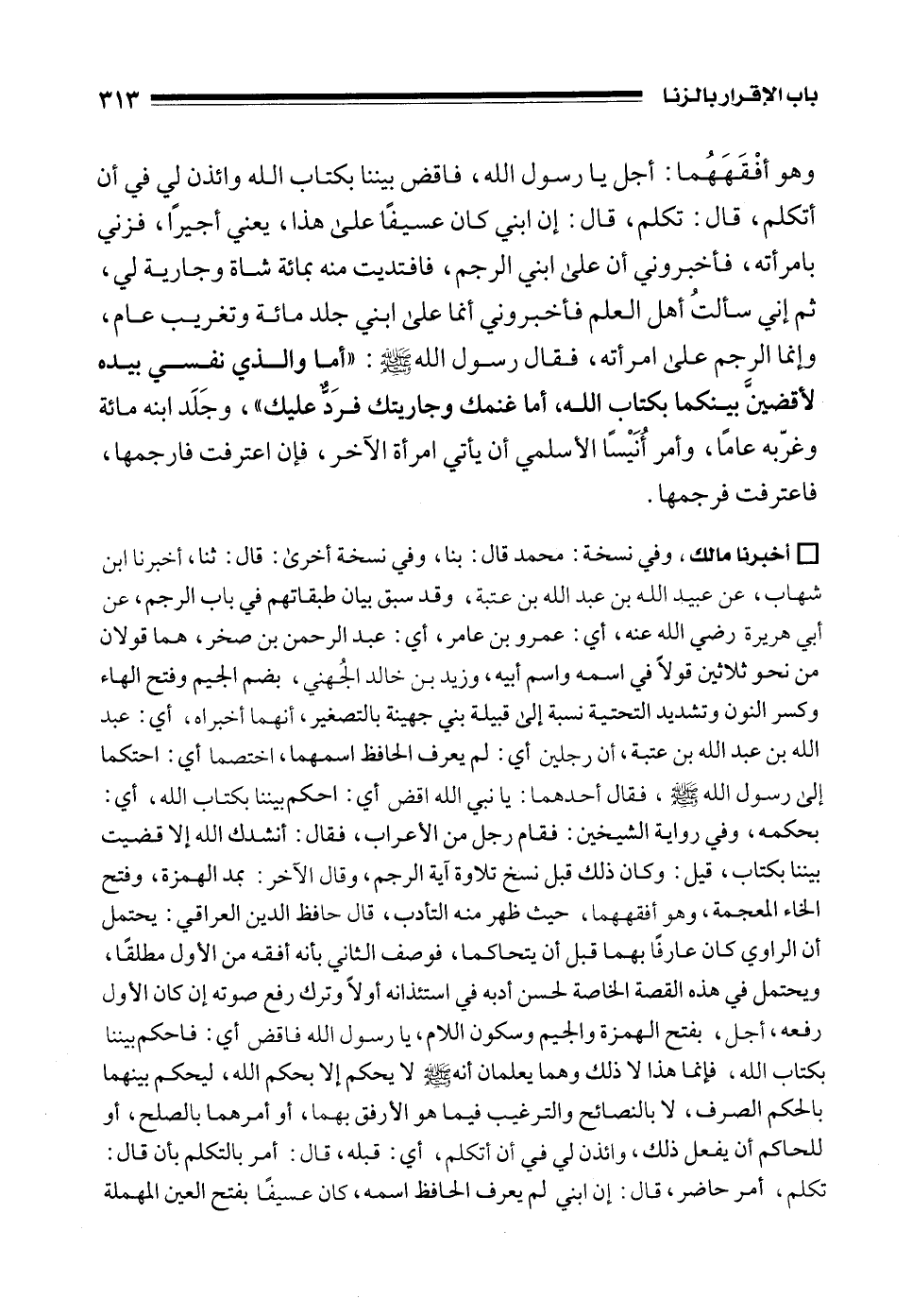 وهو أفْقَهَهُما: أجل يا رسول الله، فاقض بيننا بكتاب الله وائذن لي في أن أتكلم، قال: تكلم، قال: إن ابني كان عسيفًا على هذا، يعني أجيرًا، فزني بامرأته، فأخبروني أن على ابني الرجم، فافتديت منه بمائة شاة وجارية لي، ثم إني سألتُ أهل العلم فأخبروني أنما على ابني جلد مائة وتغريب عام، وإنما الرجم على امرأته، فقال رسول الله - صلى الله عليه وسلم -: "أما والذي نفسي بيده لأقضينَّ بينكما بكتاب الله، أما غنمك وجاريتك فرَدٌّ عليك"، وجَلَد ابنه مائة وغرّبه عامًا، وأمر أُنَيْسًا الأسلمي أن يأتي امرأة الآخر، فإن اعترفت فارجمها، فاعترفت فرجمها.