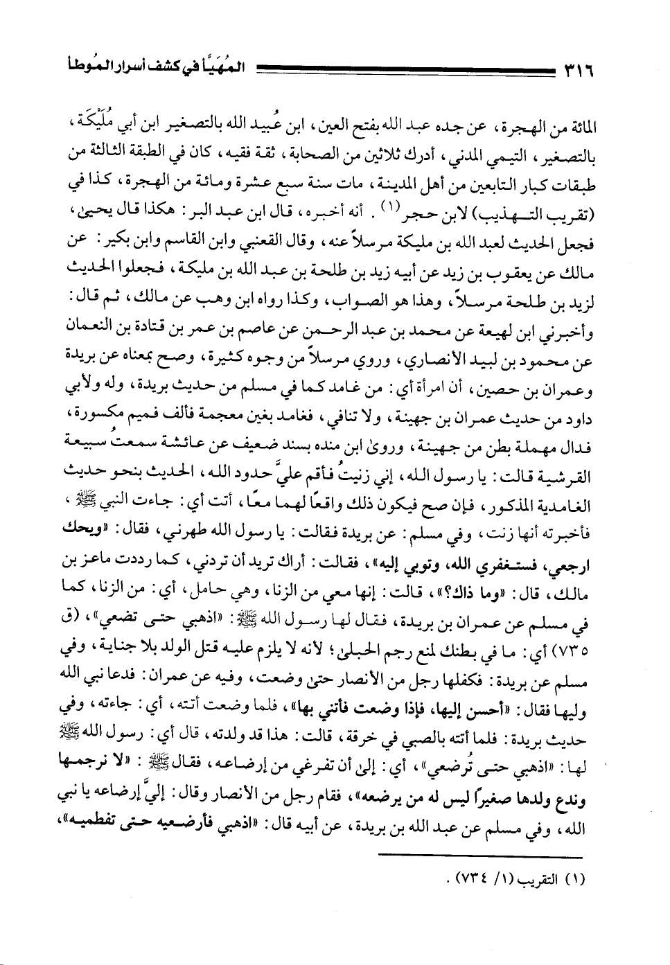 المائة من الهجرة، عن جده عبد الله بفتح العين، ابن عُبيد الله بالتصغير ابن أبي مُلَيْكَة، بالتصغير، التيمي المدني، أدرك ثلاثين من الصحابة، ثقة فقيه، كان في الطبقة الثالثة من طبقات كبار التابعين من أهل المدينة، مات سنة سبع عشرة ومائة من الهجرة، كذا في (تقريب التهذيب) لابن حجر (¬1). أنه أخبره، قال ابن عبد البر: هكذا قال يحيى، فجعل الحديث لعبد الله بن مليكة مرسلًا عنه، وقال القعنبي وابن القاسم وابن بكير: عن مالك عن يعقوب بن زيد عن أبيه زيد بن طلحة بن عبد الله بن مليكة، فجعلوا الحديث لزيد بن طلحة مرسلًا، وهذا هو الصواب، وكذا رواه ابن وهب عن مالك، ثم قال: وأخبرني ابن لهيعة عن محمد بن عبد الرحمن عن عاصم بن عمر بن قتادة بن النعمان عن محمود بن لبيد الأنصاري، وروي مرسلًا من وجوه كثيرة، وصح بمعناه عن بريدة وعمران بن حصين، أن امرأة أي: من غامد كما في مسلم من حديث بريدة، وله ولأبي داود من حديث عمران بن جهينة، ولا تنافي، فغامد بغين معجمة فألف فميم مكسورة، فدال مهملة بطن من جهينة، وروى ابن منده بسند ضعيف عن عائشة سمعتُ سبيعة القرشية قالت: يا رسول الله، إني زنيتُ فأقم عليَّ حدود الله، الحديث بنحو حديث الغامدية المذكور، فإن صح فيكون ذلك واقعًا لهما معًا، أتت أي: جاءت النبي - صلى الله عليه وسلم -، فأخبرته أنها زنت، وفي مسلم: عن بريدة فقالت: يا رسول الله طهرني، فقال: "ويحك ارجعي، فاستغفري الله، وتوبي إليه"، فقالت: أراك تريد أن تردني، كما رددت ماعز بن مالك، قال: "وما ذاك؟ "، قالت: إنها معي من الزنا، وهي حامل، أي: من الزنا، كما في مسلم عن عمران بن بريدة، ففال لها رسول الله - صلى الله عليه وسلم -: "اذهبي حتى تضعي"، (ق 735) أي: ما في بطنك لمنع رجم الحبلى؛ لأنه لا يلزم عليه قتل الولد بلا جناية، وفي مسلم عن بريدة: فكفلها رجل من الأنصار حتى وضعت، وفيه عن عمران: فدعا نبي الله وليها فقال: "أحسن إليها، فإذا وضعت فأتني بها"، فلما وضعت أتته، أي: جاءته، وفي حديث بريدة: فلما أتته بالصبي في خرقة، قالت: هذا قد ولدته، قال أي: رسول الله - صلى الله عليه وسلم - لها: "اذهبي حتى تُرضعي"، أي: إلى أن تفرغي من إرضاعه، فقال - صلى الله عليه وسلم -: "لا نرجمها وندع ولدها صغيرًا ليس له من يرضعه"، فقام رجل من الأنصار وقال: إليَّ إرضاعه يا نبي الله، وفي مسلم عن عبد الله بن بريدة، عن أبيه قال: "اذهبي فأرضعيه حتى تفطميه"،