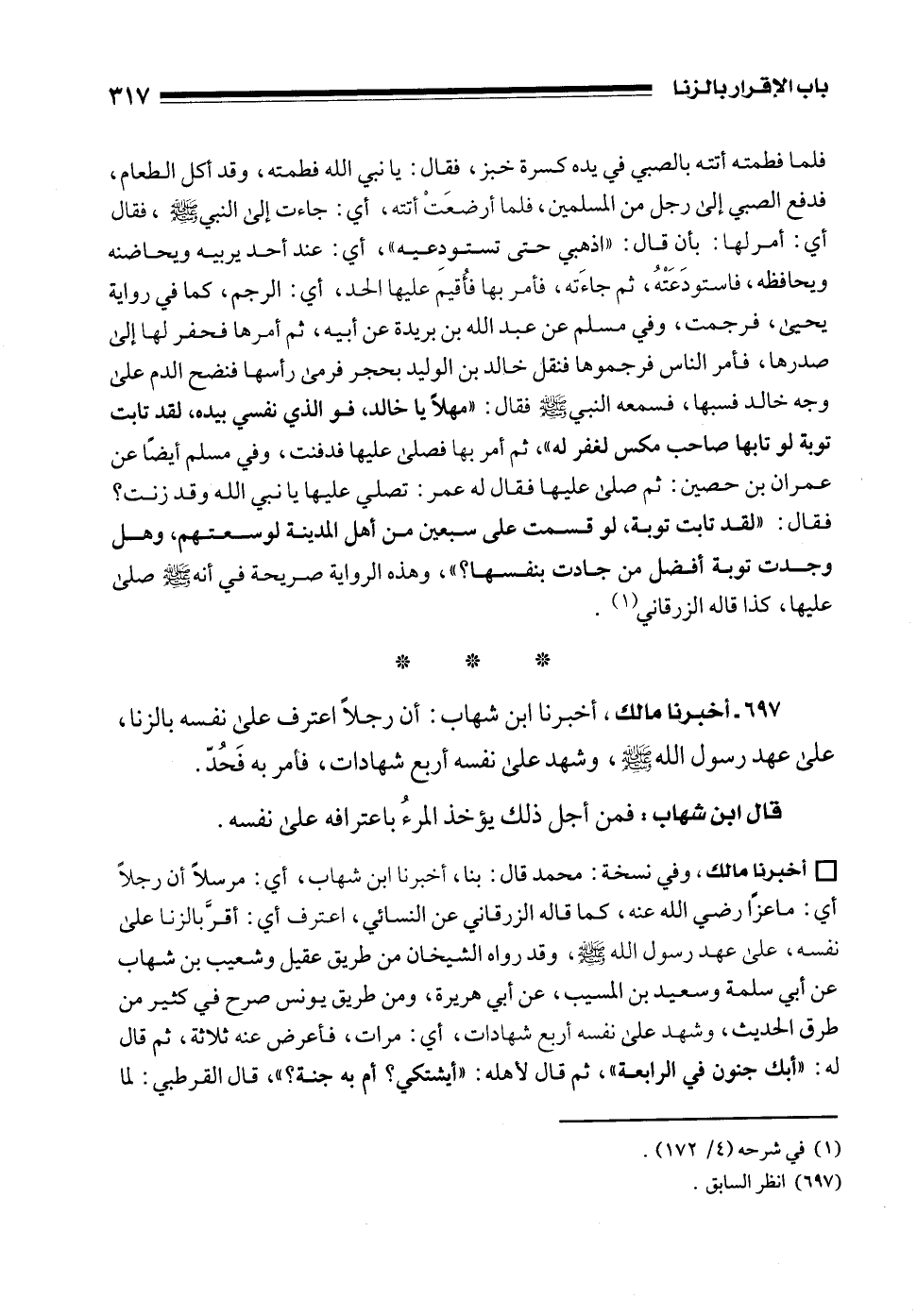 697 - أخبرنا مالك، أخبرنا ابن شهاب: أن رجلًا اعترف على نفسه بالزنا، على عهد رسول الله - صلى الله عليه وسلم -، وشهد على نفسه أربع شهادات، فأمر به فَحُدّ.