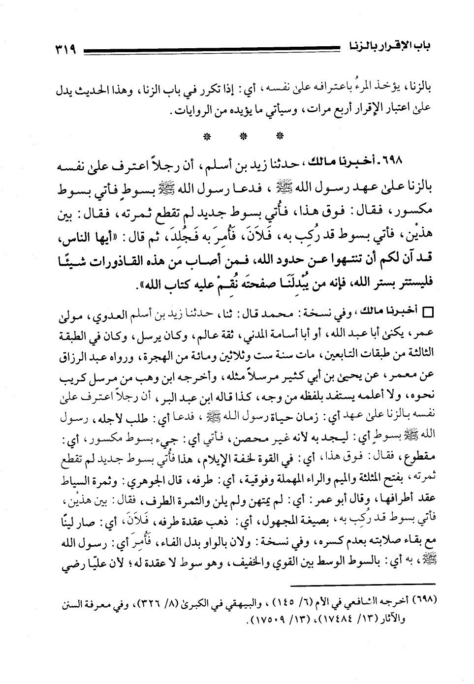 698 - أخبرنا مالك، حدثنا زيد بن أسلم، أن رجلًا اعترف على نفسه بالزنا على عهد رسول الله - صلى الله عليه وسلم -، فدعا رسول الله - صلى الله عليه وسلم - بسوطٍ فأتي بسوط مكسور، فقال: فوق هذا، فأُتي بسوط جديد لم تقطع ثمرته، فقال: بين هذيْن، فأتي بسوط قد رُكِب به، فَلَانَ، فَأُمِرَ به فَجُلِدَ، ثم قال: "أيها الناس، قد آن لكم أن تنتهوا عن حدود الله، فمن أصاب من هذه القاذورات شيئًا فليستتر بستر الله، فإنه من يُبْدِلَنَا صفحتَه نُقِمْ عليه كتاب الله".
