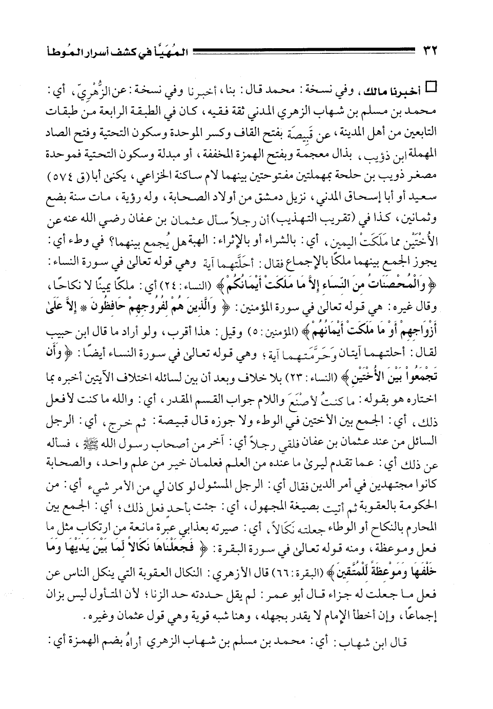 • أخبرنا مالك، وفي نسخة: محمد قال: بنا، أخبرنا وفي نسخة: عن الزُّهْرِيّ، أي: محمد بن مسلم بن شهاب الزهري المدني ثقة فقيه، كان في الطبقة الرابعة من طبقات التابعين من أهل المدينة، عن قَبِيصَة بفتح القاف وكسر الموحدة وسكون التحتية وفتح الصاد المهملة ابن ذؤيب، بذال معجمة وبفتح الهمزة المخففة، أو مبدلة وسكون التحتية فموحدة مصغر ذويب بن حلحة بمهملتين مفتوحتين بينهما لام ساكنة الخزاعي، يكنى أبا (ق 574) سعيد أو أبا إسحاق المدني، نزيل دمشق من أولاد الصحابة، وله رؤية، مات سنة بضع وثمانين، كذا في (تقريب التهذيب) أن رجلًا سأل عثمان بن عفان رضي الله عنه عن الأُخْتَيْن مما مَلَكَتْ اليمين، أي: بالشراء أو بالإِثراء: الهبة هل يُجمع بينهما؟ في وطء أي: يجوز الجمع بينهما ملكًا بالإِجماع وقال: أحَلَّتهما آية وهي قوله تعالى في سورة النساء: {وَالْمُحْصَنَاتُ مِنَ النِّسَاءِ إِلَّا مَا مَلَكَتْ أَيْمَانُكُمْ} [النساء: 24] أي: ملكًا يمينًا لا نكاحًا، وقال غيره: هي قوله تعالى في سورة المؤمنين: {وَالَّذِينَ هُمْ لِفُرُوجِهِمْ حَافِظُونَ (5) إِلَّا عَلَى أَزْوَاجِهِمْ أَوْ مَا مَلَكَتْ أَيْمَانُهُمْ} [المؤمنون: 5، 6] وقيل: هذا أقرب، ولو أراد ما قال ابن حبيب لقال: أحلتهما آيتان وَحَرَّمَتهما آية؛ وهي قوله تعالى في سورة النساء أيضًا: {وَأَنْ تَجْمَعُوا بَيْنَ الْأُخْتَيْنِ} [النساء: 23] بلا خلاف وبعد أن بين لسائله اختلاف الآيتين أخبره بما اختاره هو بقوله: ما كنتُ لأصْنَعَ واللام جواب القسم المقدر، أي: والله ما كنت لأفعل ذلك، أي: الجمع بين الأختين في الوطء ولا جوزه قال قبيصة: ثم خرج، أي: الرجل السائل من عند عثمان بن عفان فلقي رجلًا أي: آخر من أصحاب رسول الله - صلى الله عليه وسلم -، فسأله عن ذلك أي: عما تقدم ليرى ما عنده من العلم فعلمان خير من علم واحد، والصحابة كانوا مجتهدين في أمر الدين فقال أي: الرجل المسئول لو كان لي من الأمر شيء أي: من الحكومة بالعقوبة ثم أتيت بصيغة المجهول، أي: جئت بأحدٍ فعل ذلك؛ أي: الجمع بين المحارم بالنكاح أو الوطاء جعلته نَكَالًا، أي: صيرته بعذابي عبرة مانعة من ارتكاب مثل ما فعل وموعظة، ومنه قوله تعالى في سورة البقرة: {فَجَعَلْنَاهَا نَكَالًا لِمَا بَيْنَ يَدَيْهَا وَمَا خَلْفَهَا وَمَوْعِظَةً لِلْمُتَّقِينَ} [البقرة: 66] قال الأزهري: النكال العقوبة التي ينكل الناس عن فعل ما جعلت له جزاء قال أبو عمر: لم يقل حددته حد الزنا؛ لأن المتأول ليس بزان إجماعًا، وإن أخطأ الإِمام لا يقدر بجهله، وهنا شبه قوية وهي قول عثمان وغيره.