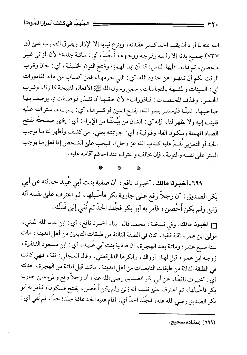 • أخبرنا مالك، وفي نسخة: محمد قال: بنا، أخبرنا نافع، أي: ابن عبد الله المدني، مولى ابن عمر، ثقة فقيه، كان في الطبقة الثالثة من طبقات التابعين من أهل المدينة، مات سنة سبع عشرة ومائة بعد الهجرة، أن صفية بنت أبي عُبيد، أي: ابن مسعود الثقفية، زوجة ابن عمر، قيل لها: أرواك، وأنكرها الدارقطني، وقال العجلي: ثقة، فهي كانت في الطبقة الثالثة من طبقات التابعيات من أهل المدينة، ماتت قبل المائة من الهجرة، حدثته أي: أخبرت نافعًا، عن أبي بكر الصديق رضي الله عنه، أن رجلًا وقع وطئ على جارية بكر فأحْبلها، ثم اعترف على نفسه أنه زنى ولم يكن أُحْصن، بفتح فسكون، فأمر به أبو بكر الصديق رضي الله عنه، فجُلد الحدّ أي: أقام عليه الحد بمائة جلدة حدًا، ثم نُفي أي: