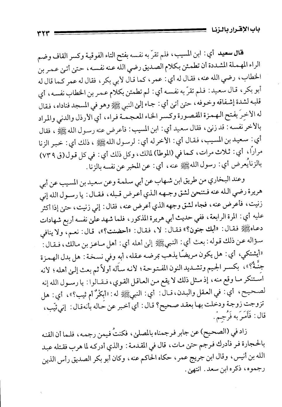 قال سعيد أي: ابن المسيب، فلم تقرّ به نفسه بفتح التاء الفوقية وكسر القاف وضم الراء المهملة المشددة أن تطمئن بكلام الصديق رضي الله عنه نفسه، حتى أتى عمر بن الخطاب، رضي الله عنه، فقال له أي: عمر، كما قال لأبي بكر، فقال له عمر كما قال له أبو بكر، قال سعيد: فلم تقرّ به نفسه أي: لم تطمئن بكلام عمر بن الخطاب نفسه، أي قلبه لشدة إشفاقه وخوفه، حتى أتى أي: جاء إلى النبي - صلى الله عليه وسلم - وهو في المسجد فناداه، فقال له الأخِرَ بفتح الهمزة المقصورة وكسر الخاء المعجمة فراء، أي الأرذل والدني والمراد بالأخر نفسه: قد زنى، فقال سعيد أي: ابن المسيب: فأعرض عنه رسول الله - صلى الله عليه وسلم -، فقال أي: سعيد بن المسيب، فقال أي: الأخر له أي: لرسول الله - صلى الله عليه وسلم -، ذلك أي: خبر الزنا مرارًا، أي: ثلاث مرات، كما في (الموطأ) لمالك، وكل ذلك أي: في كل قول (ق 739) بالزنا يُعرض أي: رسول الله - صلى الله عليه وسلم - عنه، أي: عن المخبر عن نفسه بالزنا.