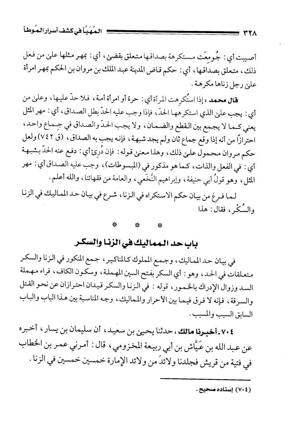 704 - أخبرنا مالك، حدثنا يحيى بن سعيد، أن سليمان بن يسار، أخبره عن عبد الله بن عَيَّاش بن أبي ربيعة المخزومي، قال: أمرني عمر بن الخطاب في فتية من قريش فجلدنا ولائدَ من ولائد الإِمارة خمسين خمسين في الزنا.