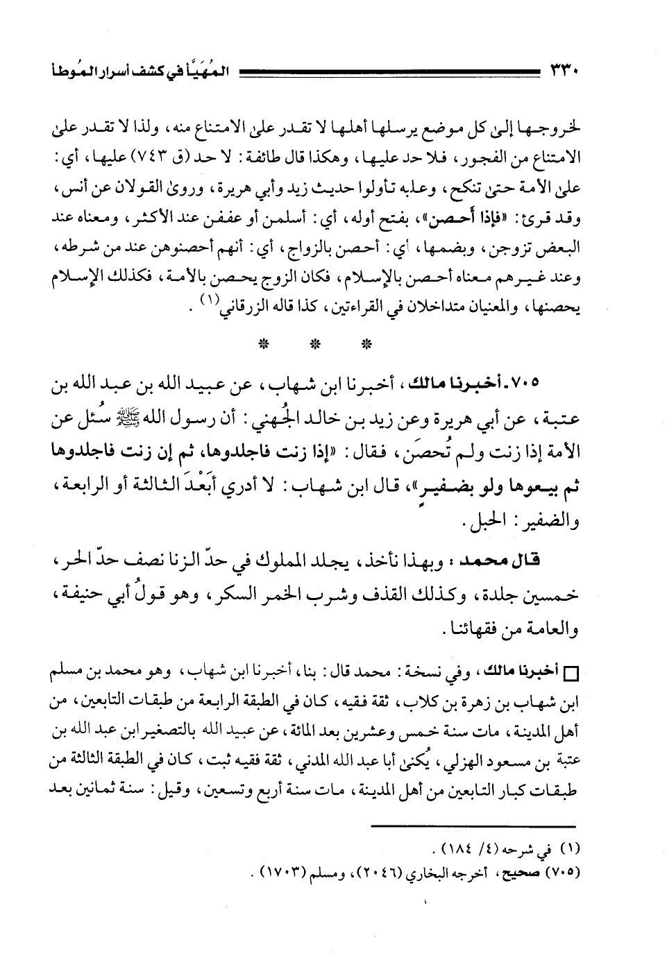 705 - أخبرنا مالك، أخبرنا ابن شهاب، عن عبيد الله بن عبد الله بن عتبة، عن أبي هريرة وعن زيد بن خالد الجُهني: أن رسول الله - صلى الله عليه وسلم - سُئل عن الأمة إذا زنت ولم تُحصَن، فقال: "إذا زنت فاجلدوها، ثم إن زنت فاجلدوها ثم بيعوها ولو بضفيرٍ"، قال ابن شهاب: لا أدري أبَعْدَ الثالثة أو الرابعة، والضفير: الحبل.