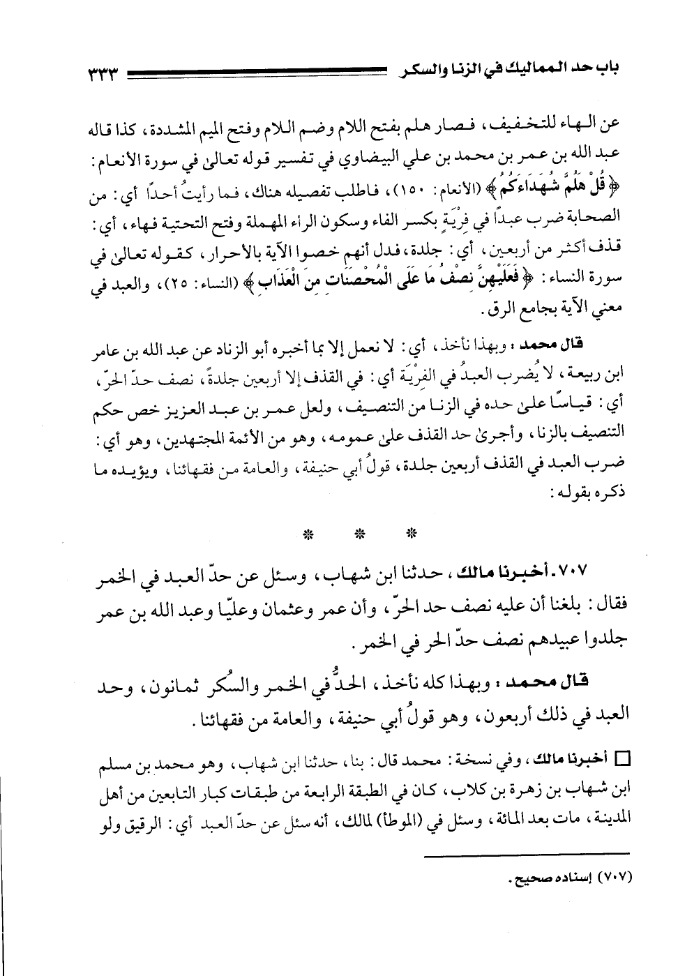 707 - أخبرنا مالك، حدثنا ابن شهاب، وسئل عن حدّ العبد في الخمر فقال: بلغنا أن عليه نصف حد الحرّ، وأن عمر وعثمان وعليّا وعبد الله بن عمر جلدوا عبيدهم نصف حدّ الحر في الخمر.