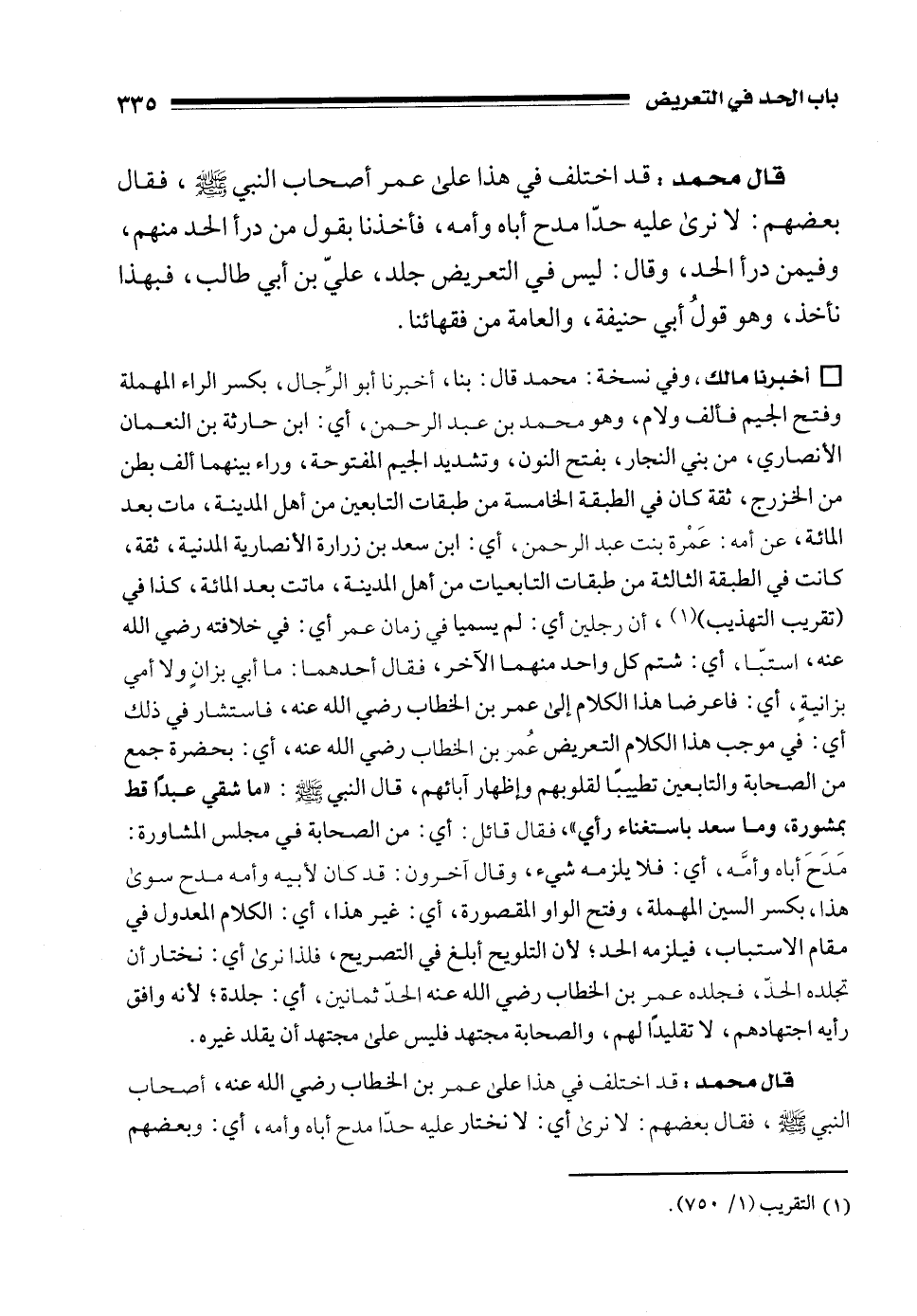 قال محمد: قد اختلف في هذا على عمر أصحاب النبي - صلى الله عليه وسلم -، فقال بعضهم: لا نرى عليه حدّا مدح أباه وأمه، فأخذنا بقول من درأ الحد منهم، وفيمن درأ الحد، وقال: ليس في التعريض جلد، عليّ بن أبي طالب، فبهذا نأخذ، وهو قولُ أبي حنيفة، والعامة من فقهائنا.