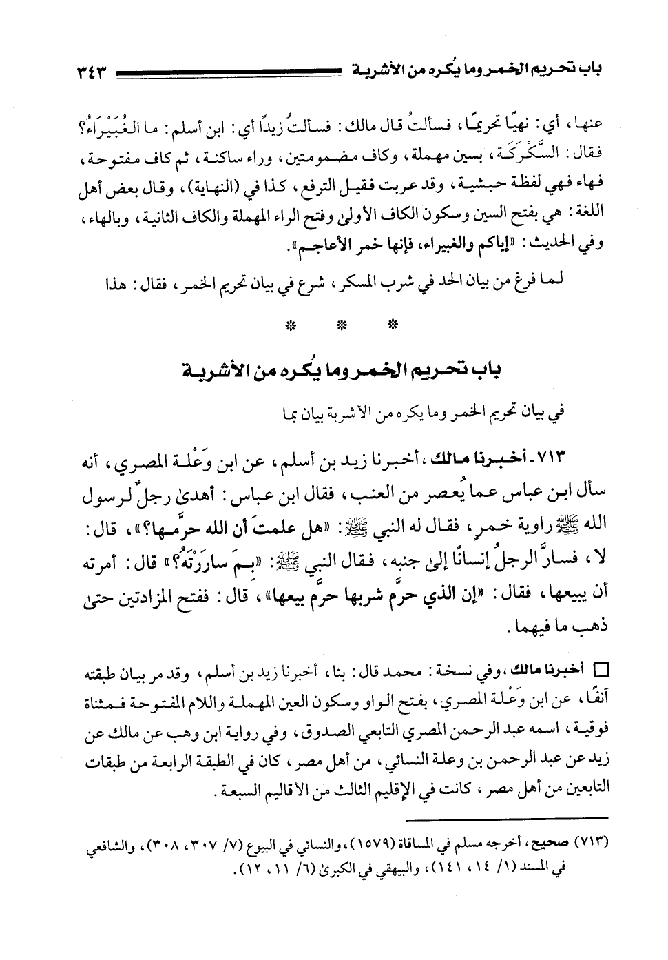 713 - أخبرنا مالك، أخبرنا زيد بن أسلم، عن ابن وَعْلة المصري، أنه سأل ابن عباس عما يُعصر من العنب، فقال ابن عباس: أهدى رجلٌ لرسول الله - صلى الله عليه وسلم - راوية خمرٍ، فقال له النبي - صلى الله عليه وسلم -: "هل علمتَ أن الله حرَّمها؟ "، قال: لا، فسارَّ الرجلُ إنسانًا إلى جنبه، فقال النبي - صلى الله عليه وسلم -: "بِمَ سارَرْتَهُ؟ " قال: أمرته أن يبيعها، فقال: "إن الذي حرَّم شربها حرَّم بيعها"، قال: ففتح المزادتين حتى ذهب ما فيهما.