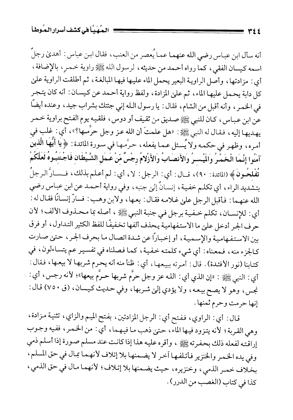 أنه سأل ابن عباس رضي الله عنهما عما يُعصر من العنب، فقال ابن عباس: أهدى رجلٌ اسمه كيسان الفقي، كما رواه أحمد من حديثه، لرسول الله - صلى الله عليه وسلم - راوية خمرٍ، بالإِضافة، أي: مزادتها، وأصل الراوية البعير يحمل الماء عليها فيها المبالغة، ثم أطلقت الراوية على كل دابة يحمل عليها الماء، ثم على المزادة، ولفظ رواية أحمد عن كيسان: أنه كان يتجر في الخمر، وأنه أقبل من الشام، فقال: يا رسول الله إني جئتك بشراب جيد، وعنده أيضًا عن ابن عباس، كان للنبي - صلى الله عليه وسلم - صديق من ثقيف أو دوس، فلقيه يوم الفتح براوية خمر يهديها إليه، فقال له النبي - صلى الله عليه وسلم -: "هل علمتَ أن الله عز وجل حرَّمها؟ "، أي: غلب في أمره، وظهر في حكمه ولا يُسئل عما يفعله، حرَّمها في سورة المائدة: {يَاأَيُّهَا الَّذِينَ آمَنُوا إِنَّمَا الْخَمْرُ وَالْمَيْسِرُ وَالْأَنْصَابُ وَالْأَزْلَامُ رِجْسٌ مِنْ عَمَلِ الشَّيْطَانِ فَاجْتَنِبُوهُ لَعَلَّكُمْ تُفْلِحُونَ} [المائدة: 90]، قال: أي: الرجل: لا، أي: لم أعلم بذلك، فسارَّ الرجلُ بتشديد الراء، أي تكلم خفية، إنسانٌ إلى جنبه، وفي رواية أحمد عن ابن عباس رضي الله عنهما: فأقبل الرجل على غلامه فقال: بعها، ولابن وهب: فسارّ إنسانًا فقال له: أي: للإِنسان، تكلم خفية برجل في جنبة النبي - صلى الله عليه وسلم -، أصله بما محذوف الألف؛ لأن حرف الجر أدخل على ما الاستفهامية يحذف ألفها تخفيفًا للفظ الكثير التداول، أو فرق بين الاستفهامية والإِسمية، أو إخبارًا عن شدة اتصال ما بحرف الجر، حتى صارت كالجزء منه، فمعناه: أي شيء كلمته خفية، كما فصلناه في تفسير عم يتساءلون، في كتابنا (نور الأفئدة). قال: أمرته ببيعها، أي: ظنًا منه أنه يحرم شربها لا بيعها، فقال: أي: النبي - صلى الله عليه وسلم -: "إن الذي أي: الله عز وجل حرَّم شربها حرَّم بيعها"؛ لأنه رجس، أي: نجس، وهو لا يصح بيعه، ولا يؤدي إلى شربها، وفي حديث كيسان، (ق 750) قال: إنها حرمت وحرم ثمنها.