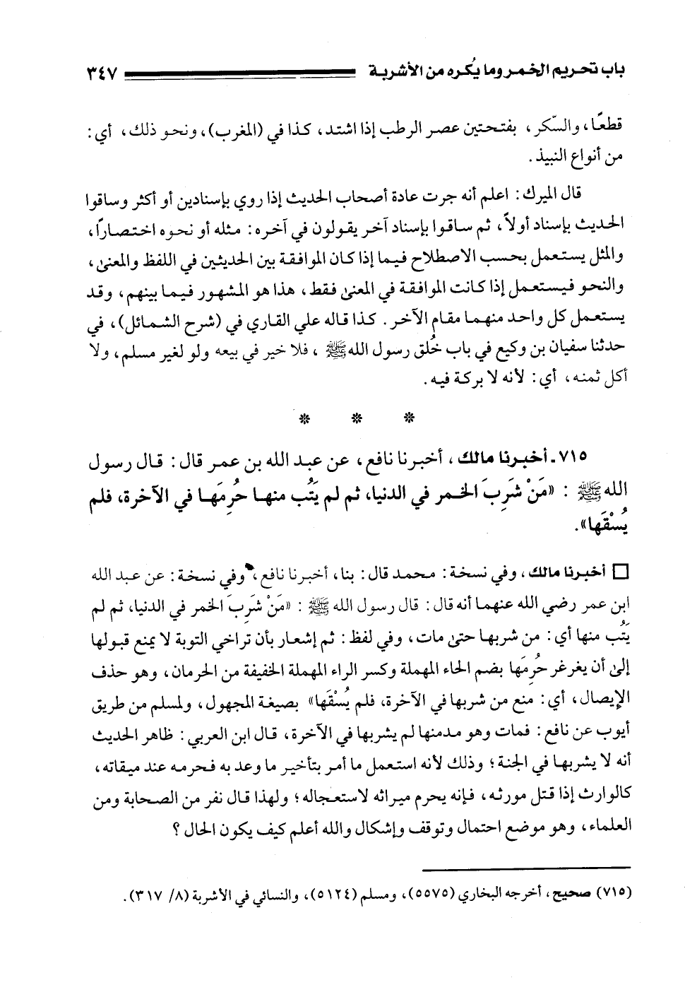 715 - أخبرنا مالك، أخبرنا نافع، عن عبد الله بن عمر قال: قال رسول الله - صلى الله عليه وسلم -: "مَنْ شَرِبَ الخمر في الدنيا، ثم لم يَتُب منها حُرِمَها في الآخرة، فلم يُسْقَها".