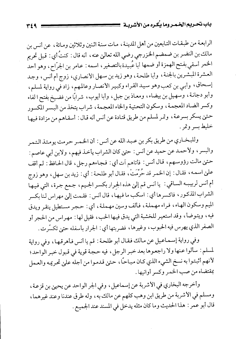 الرابعة من طبقات التابعين من أهل المدينة، مات سنة اثنين وثلاثين ومائة، عن أنس بن مالك بن النضر بن ضمضم الخزرجي رضي الله تعالى عنه، أنه قال: كنتُ أي: قبل تحريم الخمر أسقي بفتح الهمزة أو ضمها أبا عُبيدة بالتصغير، اسمه: عامر بن الجرّاح، وهو أحد العشرة المبشرين بالجنة، وأبا طلحة، وهو زيد بن سهل الأنصاري، زوج أم أنس، وجد إسحاق، وأبي بن كعب وهو سيد القراء وكبير الأنصار وعالمهم، زاد في رواية لمسلم، وأبو دجانة، وسهيل بن بيضاء، ومعاذ بن جبل، وأبا أيوب، شرابًا من فضيخ بفتح الفاء وكسر الضاد المعجمة، وسكون التحتية والخاء المعجمة، شراب يتخذ من البسر المكسور حتى يسكر بسرعة، وتمر لمسلم من طريق قتادة عن أنس أنه قال: أسقاهم من مزادة فيها خليط بسر وتمر.