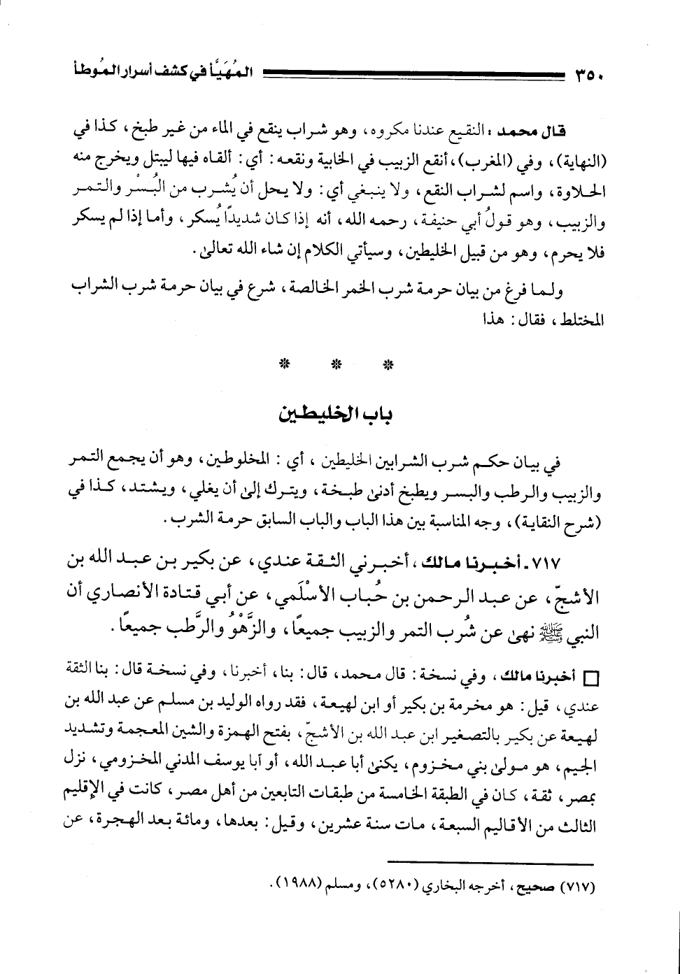 717 - أخبرنا مالك، أخبرني الثقة عندي، عن بكير بن عبد الله بن الأشجّ، عن عبد الرحمن بن حُباب الأسْلَمي، عن أبي قتادة الأنصاري أن النبي - صلى الله عليه وسلم - نهى عن شُرب التمر والزبيب جميعًا، والزَّهْوُ والرَّطب جميعًا.