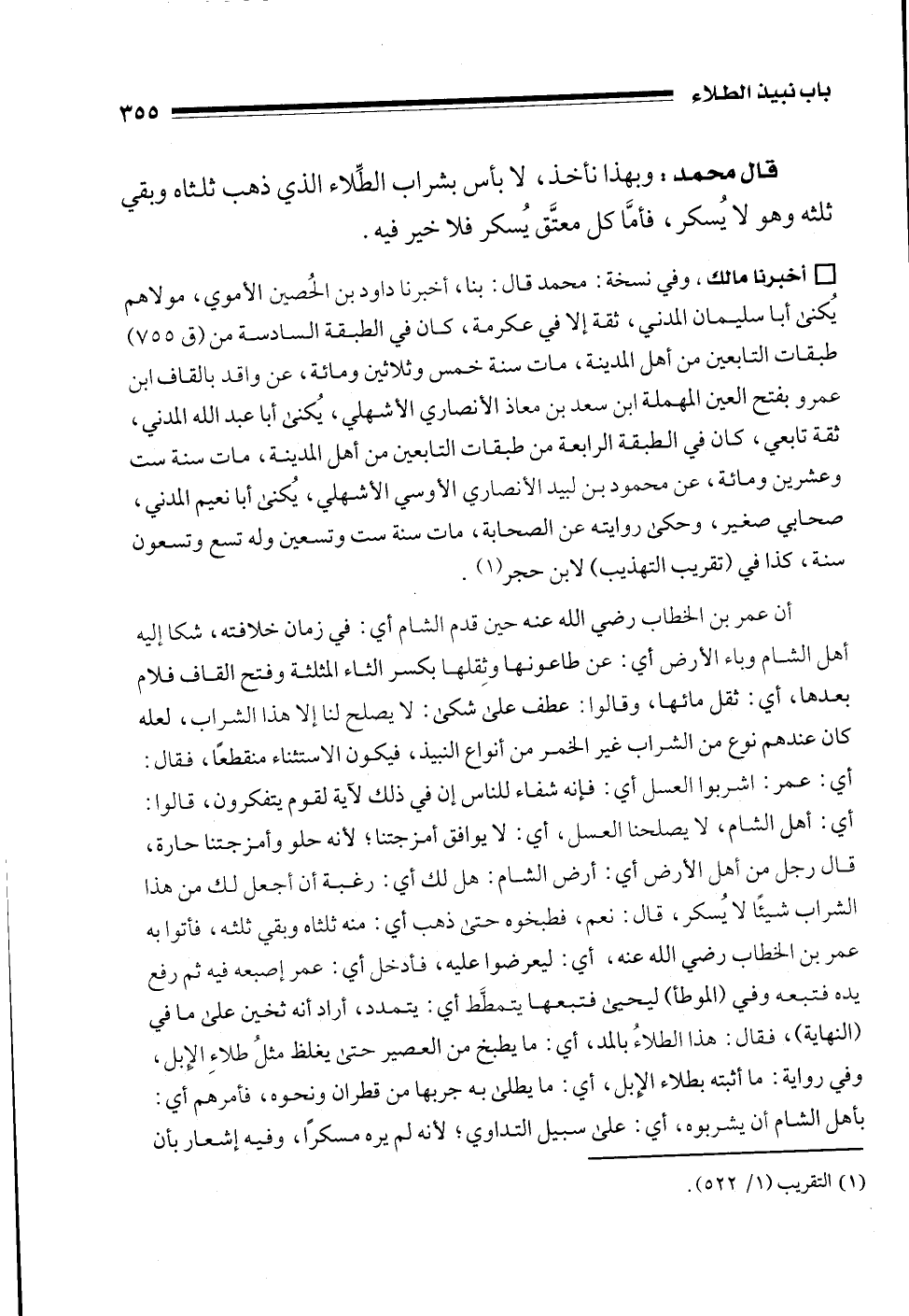 أن عمر بن الخطاب رضي الله عنه حين قدم الشام أي: في زمان خلافته، شكا إليه أهل الشام وباء الأرض أي: عن طاعونها وثِقلها بكسر الثاء المثلثة وفتح القاف فلام بعدها، أي: ثقل مائها، وقالوا: عطف على شكى: لا يصلح لنا إلا هذا الشراب، لعله كان عندهم نوع من الشراب غير الخمر من أنواع النبيذ، فيكون الاستثناء منقطعًا، فقال: أي: عمر: اشربوا العسل أي: فإنه شفاء للناس إن في ذلك لآية لقوم يتفكرون، قالوا: أي: أهل الشام، لا يصلحنا العسل، أي: لا يوافق أمزجتنا؛ لأنه حلو وأمزجتنا حارة، قال رجل من أهل الأرض أي: أرض الشام: هل لك أي: رغبة أن أجعل لك من هذا الشراب شيئًا لا يُسكر، قال: نعم، فطبخوه حتى ذهب أي: منه ثلثاه وبقي ثلثه، فأتوا به عمر بن الخطاب رضي الله عنه، أي: ليعرضوا عليه، فأدخل أي: عمر إصبعه فيه ثم رفع يده فتبعه وفي (الموطأ) ليحيى فتبعها يتمطَّط أي: يتمدد، أراد أنه ثخين على ما في (النهاية)، فقال: هذا الطلاءُ بالمد، أي: ما يطبخ من العصير حتى يغلظ مثلُ طلاءِ الإِبل، وفي رواية: ما أثبته بطلاء الإِبل، أي: ما يطلى به جربها من قطران ونحوه، فأمرهم أي: بأهل الشام أن يشربوه، أي: على سبيل التداوي؛ لأنه لم يره مسكرًا، وفيه إشعار بأن