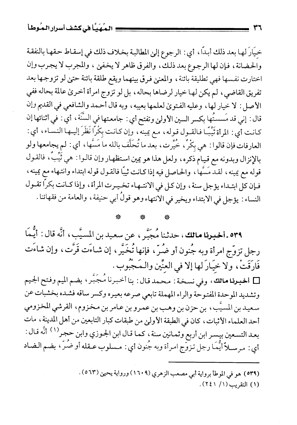 539 - أخبرنا مالك، حدثنا مُجَبَّر، عن سعيد بن المسيَّب، أنَّه قال: أيُّمَا رجل تزوّج امرأة وبه جُنون أو ضُرّ، فإنها تُخَيَّر، إن شاءَت قَرَّت، وإن شاءَت فَارَقَتْ، ولا خِيَارَ لها إلا في العِنِّين والمَجْبُوب.