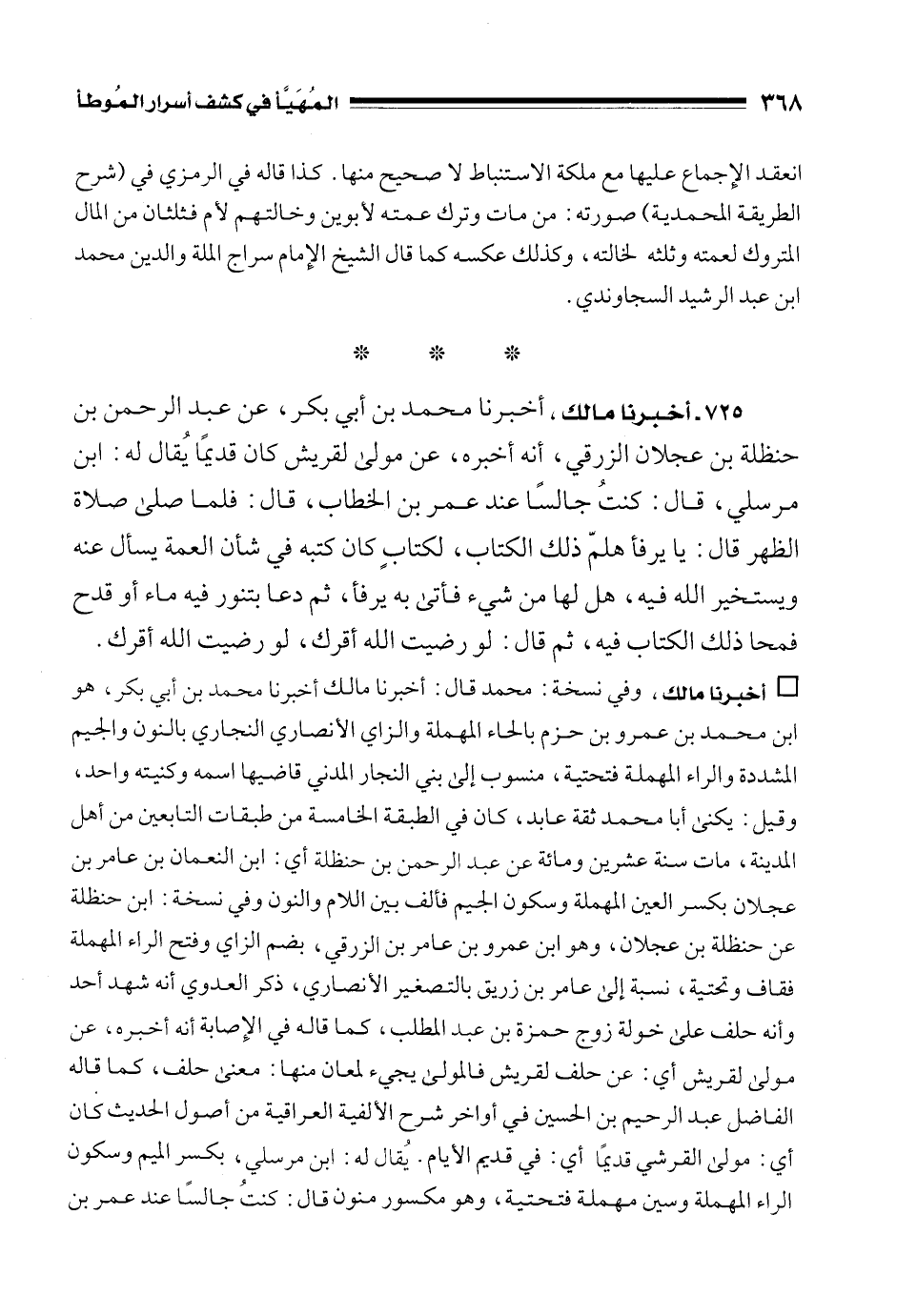 725 - أخبرنا مالك، أخبرنا محمد بن أبي بكر، عن عبد الرحمن بن حنظلة بن عجلان الزرقي، أنه أخبره، عن مولى لقريش كان قديمًا يُقال له: ابن مرسلي، قال: كنتُ جالسًا عند عمر بن الخطاب، قال: فلما صلى صلاة الظهر قال: يا يرفأ هلمّ ذلك الكتاب، لكتابٍ كان كتبه في شأن العمة يسأل عنه ويستخير الله فيه، هل لها من شيء فأتى به يرفأ، ثم دعا بتنور فيه ماء أو قدح فمحا ذلك الكتاب فيه، ثم قال: لو رضيت الله أقرك، لو رضيت الله أقرك.