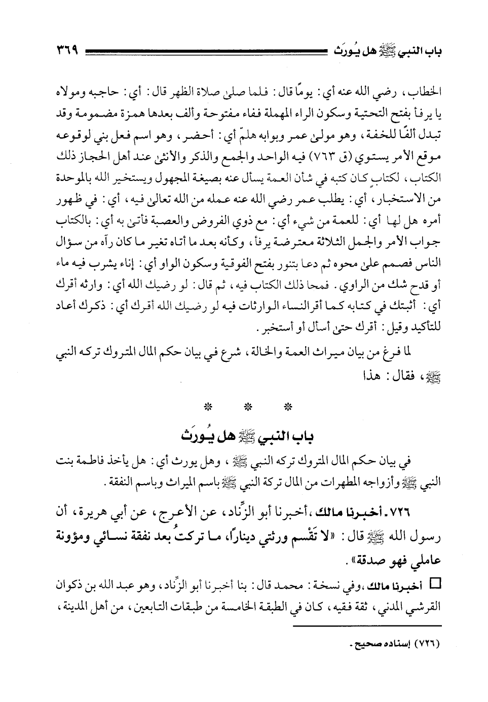 726 - أخبرنا مالك، أخبرنا أبو الزِّناد، عن الأعرج، عن أبي هريرة، أن رسول الله - صلى الله عليه وسلم - قال: "لا تَقْسم ورثتي دينارًا، ما تركتُ بعد نفقة نسائي ومؤونة عاملي فهو صدقة".