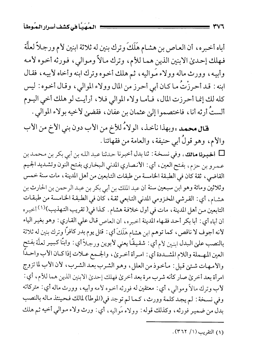 • أخبرنا مالك، وفي نسخة: ثنا بدل أخبرنا حدثنا عبد الله بن أبي بكر بن محمد بن عمرو بن حزم، بفتح العين، أي: الأنصاري المدني البخاري بفتح النون وتشديد الجيم القاضي، ثقة كان في الطبقة الخامسة من طبقات التابعين من أهل المدينة، مات سنة خمس وثلاثين ومائة وهو ابن سبعين سنة أن عبد الملك بن أبي بكر بن عبد الرحمن بن الحارث بن هشام، أي: القرشي المخزومي المدني التابعي ثقة، كان في الطبقة الخامسة من طبقات التابعين من أهل المدينة، مات في أول خلافة هشام. كذا في (تقريب التهذيب) (¬1) أخبره أن أباه أي: أبا بكر أحد فقهاء المدينة أخبره، أن العاص قال علي القاري: وهو بغير الياء لأنه أجوف لا ناقص، كما توهم ابن هشام هَلَكَ أي: قتل يوم بدر كافرًا وترك بنين له ثلاثة بالنصب على البدل ابنين لأم أي: شقيقًا يعني لأبوين ورجلًا أي: وابنًا كبير لعلَّه بفتح العين المهملة واللام المشددة أي: امرأة أخرى، والجمع علات إذا كان الأب واحدًا والأمهات شتى قيل: مأخوذ من العلل، وهو الشرب بعد الشرب، لأن الأب لما تزوج امرأة بعد أخرى صار كأنه شرب مرة بعد أخرى فهلك إحدى الابنين الذين هما للأم، أي: لأب وترك مالًا وموالي، أي: معتقين له فورثه أخوه لأمه وأبيه، وورث ماله أي: متركاته وفي نسخة: لم يجد كلمة وورث، كما لم توجد في (الموطأ) لمالك فحينئذ ماله بالنصب بدل من ضمير فورثه، وكذلك قوله: وولاء مَواليه، أي: ورث ولاء موالي أخيه ثم هلك