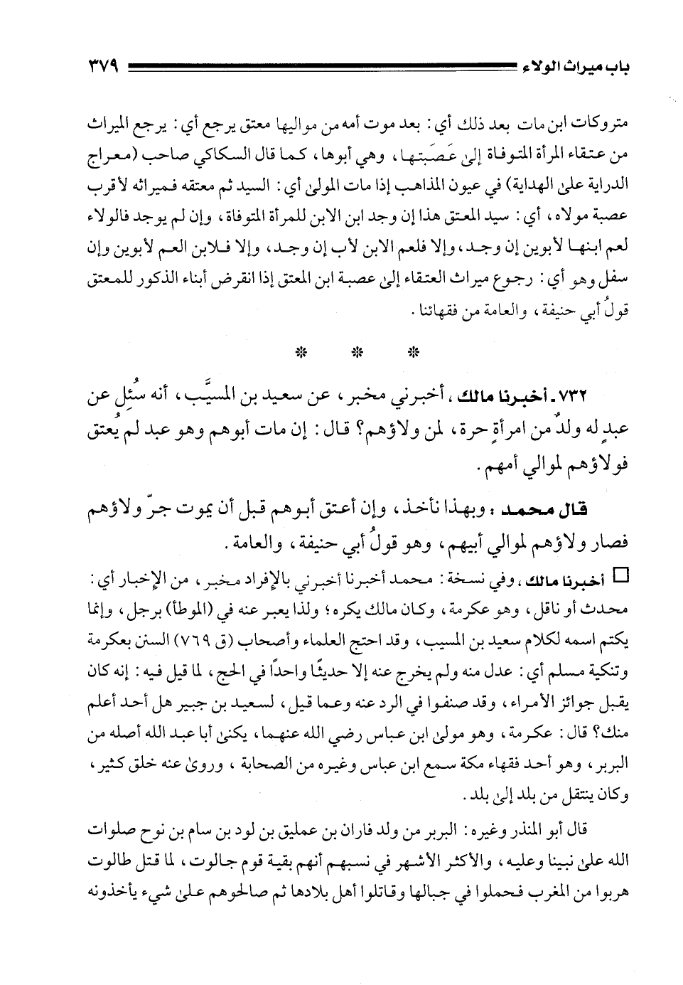 732 - أخبرنا مالك، أخبرني مخبر، عن سعيد بن المسيَّب، أنه سُئِل عن عبدٍ له ولدٌ من امرأةٍ حرة، لمن ولاؤهم؟ قال: إن مات أبوهم وهو عبد لم يُعتق فولاؤهم لموالي أمهم.