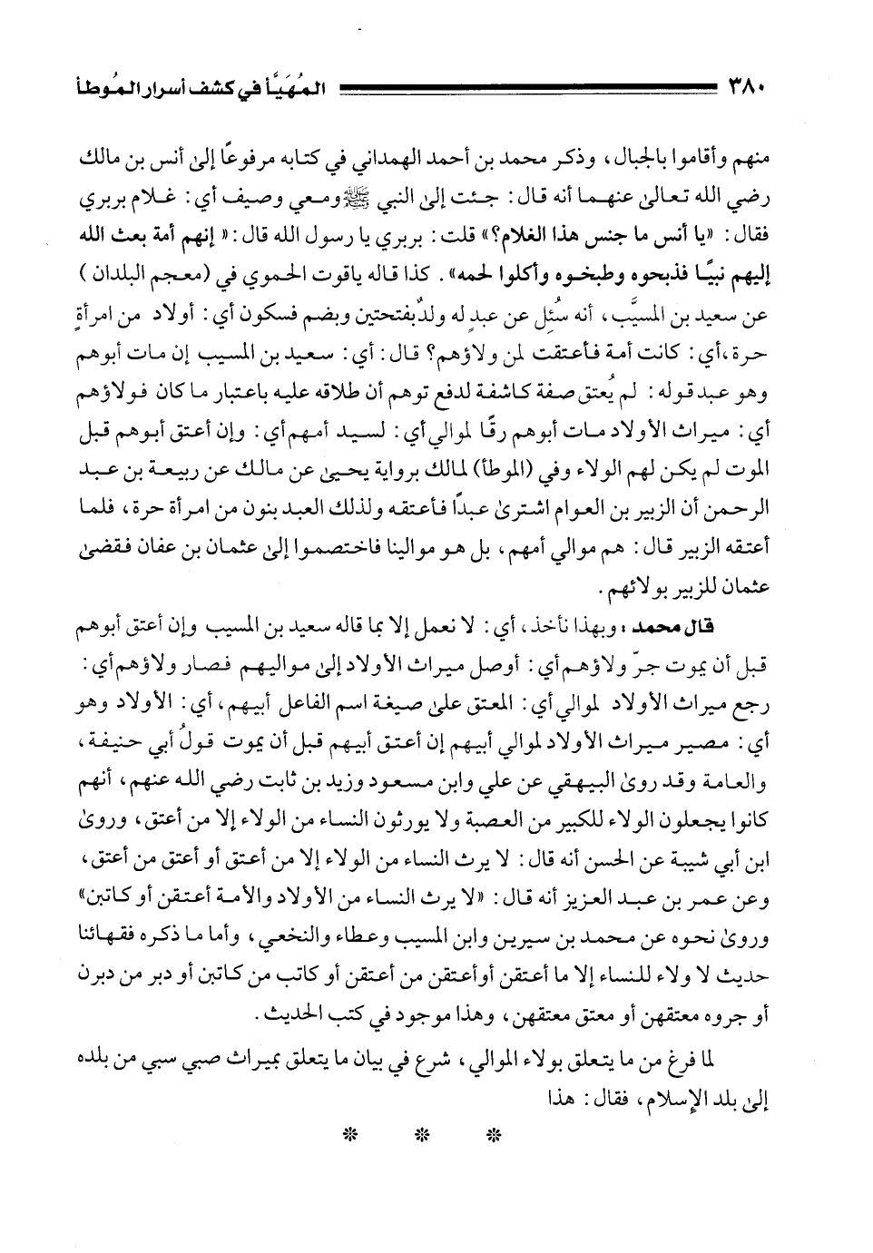 منهم وأقاموا بالجبال، وذكر محمد بن أحمد الهمداني في كتابه مرفوعًا إلى أنس بن مالك رضي الله تعالى عنهما أنه قال: جئت إلى النبي - صلى الله عليه وسلم - ومعي وصيف أي: غلام بربري فقال: "يا أنس ما جنس هذا الغلام؟ " قلت: بربري يا رسول الله قال: "إنهم أمة بعث الله إليهم نبيًا فذبحوه وطبخوه وأكلوا لحمه". كذا قاله ياقوت الحموي في (معجم البلدان) عن سعيد بن المسيَّب، أنه سُئِل عن عبدٍ له ولدٌ بفتحتين وبضم فسكون أي: أولاد من امرأةٍ حرة، أي: كانت أمة فأعتقت لمن ولاؤهم؟ قال: أي: سعيد بن المسيب إن مات أبوهم وهو عبد قوله: لم يُعتق صفة كاشفة لدفع توهم أن طلاقه عليه باعتبار ما كان فولاؤهم أي: ميراث الأولاد مات أبوهم رقًا لموالي أي: لسيد أمهم أي: وإن أعتق أبوهم قبل الموت لم يكن لهم الولاء وفي (الموطأ) لمالك برواية يحيى عن مالك عن ربيعة بن عبد الرحمن أن الزبير بن العوام اشترى عبدًا فأعتقه ولذلك العبد بنون من امرأة حرة، فلما أعتقه الزبير قال: هم موالي أمهم، بل هو موالينا فاختصموا إلى عثمان بن عفان فقضى عثمان للزبير بولائهم.