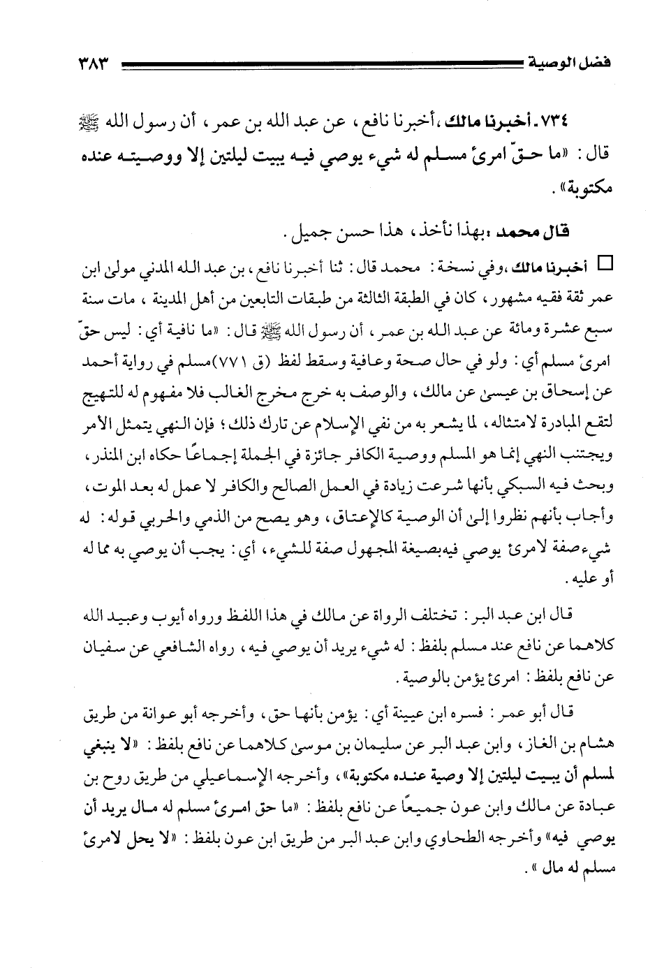 734 - أخبرنا مالك، أخبرنا نافع، عن عبد الله بن عمر، أن رسول الله - صلى الله عليه وسلم - قال: "ما حقّ امرئ مسلم له شيء يوصي فيه يبيت ليلتين إلا ووصيته عنده مكتوبة".