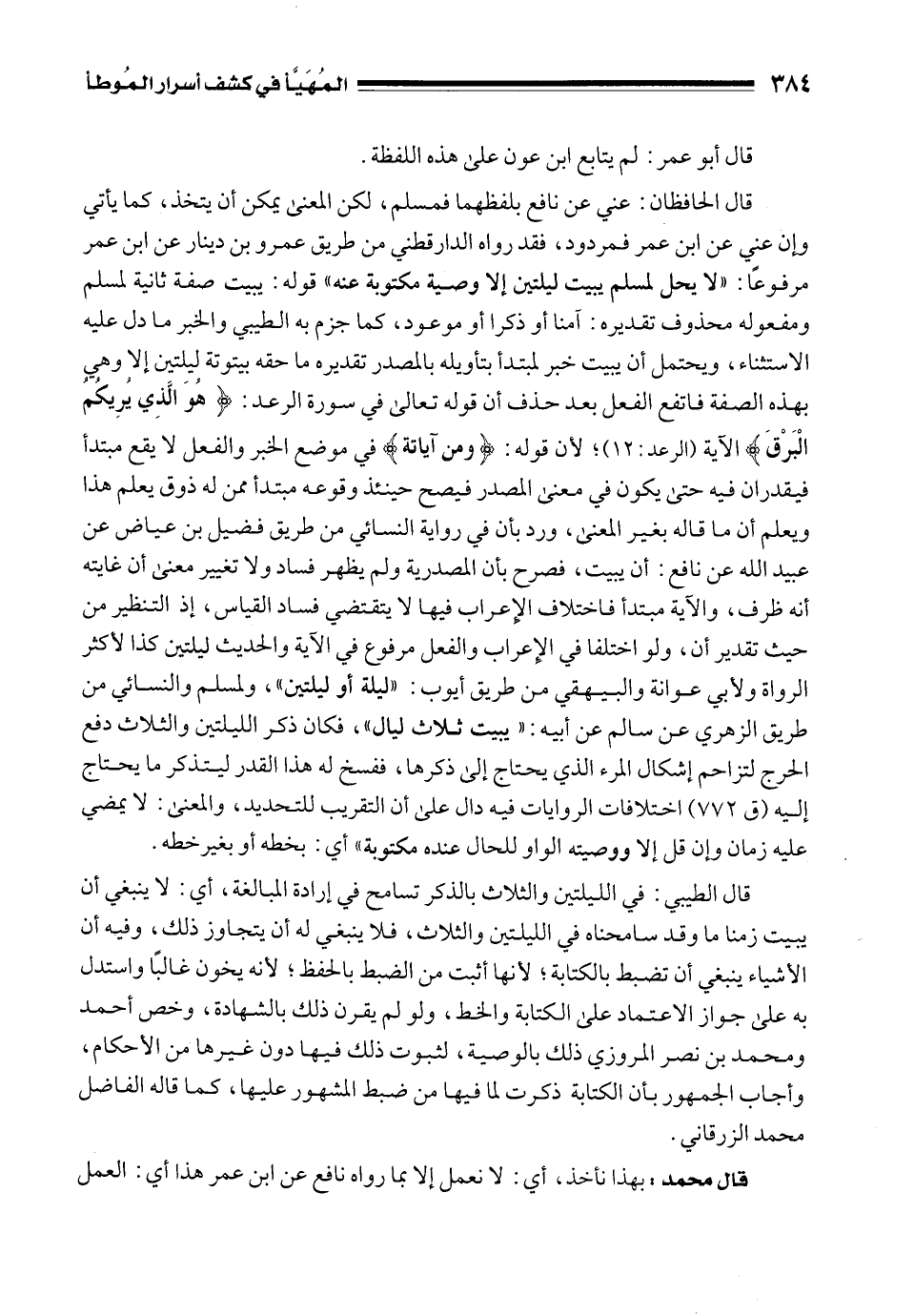 قال الحافظان: عني عن نافع بلفظهما فمسلم، لكن المعنى يمكن أن يتخذ، كما يأتي وإن عني عن ابن عمر فمردود، فقد رواه الدارقطني من طريق عمرو بن دينار عن ابن عمر مرفوعًا: "لا يحل لمسلم يبيت ليلتين إلا وصية مكتوبة عنه" قوله: يبيت صفة ثانية لمسلم ومفعوله محذوف تقديره: آمنا أو ذكرا أو موعود، كما جزم به الطيبي والخبر ما دل عليه الاستثناء، ويحتمل أن يبيت خبر لمبتدأ بتأويله بالمصدر تقديره ما حقه بيتوتة ليلتين إلا وهي بهذه الصفة فاتفع الفعل بعد حذف أن قوله تعالى في سورة الرعد: {هُوَ الَّذِي يُرِيكُمُ الْبَرْقَ} الآية [الرعد: 12]؛ لأن قوله: {وَمِنْ آيَاتِهِ} في موضع الخبر والفعل لا يقع مبتدأ فيقدران فيه حتى يكون في معنى المصدر فيصح حينئذ وقوعه مبتدأ ممن له ذوق يعلم هذا ويعلم أن ما قاله بغير المعنى، ورد بأن في رواية النسائي من طريق فضيل بن عياض عن عبيد الله عن نافع: أن يبيت، فصرح بأن المصدرية ولم يظهر فساد ولا تغيير معنى أن غايته أنه ظرف، والآية مبتدأ فاختلاف الإِعراب فيها لا يقتضي فساد القياس، إذ التنظير من حيث تقدير أن، ولو اختلفا في الإِعراب والفعل مرفوع في الآية والحديث ليلتين كذا لأكثر الرواة ولأبي عوانة والبيهقي من طريق أيوب: "ليلة أو ليلتين"، ولمسلم والنسائي من طريق الزهري عن سالم عن أبيه: "يبيت ثلاث ليال"، فكان ذكر الليلتين والثلاث دفع الحرج لتزاحم إشكال المرء الذي يحتاج إلى ذكرها، ففسخ له هذا القدر ليتذكر ما يحتاج إليه (ق 772) اختلافات الروايات فيه دال على أن التقريب للتحديد، والمعنى: لا يمضي عليه زمان وإن قل إلا ووصيته الواو للحال عنده مكتوبة" أي: بخطه أو بغير خطه.