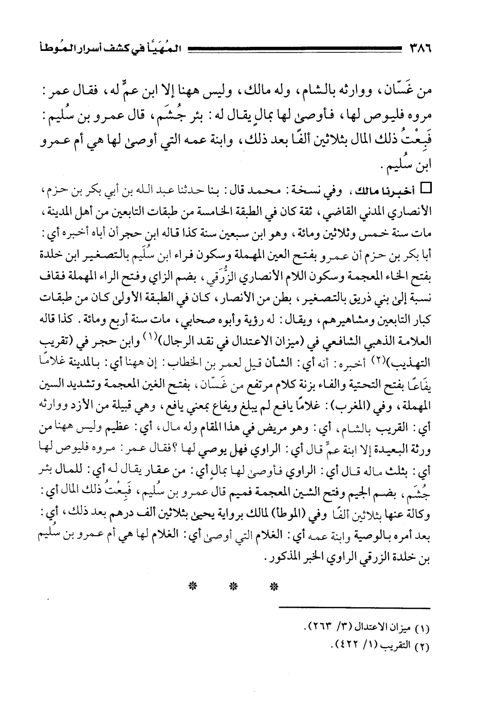 • أخبرنا مالك، وفي نسخة: محمد قال: بنا حدثنا عبد الله بن أبي بكر بن حزم، الأنصاري المدني القاضي، ثقة كان في الطبقة الخامسة من طبقات التابعين من أهل المدينة، مات سنة خمس وثلاثين ومائة، وهو ابن سبعين سنة كذا قاله ابن حجر أن أباه أخبره أي: أبا بكر بن حزم أن عمرو بفتح العين المهملة وسكون فراء ابن سُلَيم بالتصغير ابن خلدة بفتح الخاء المعجمة وسكون اللام الأنصاري الزُّرَقي، بضم الزاي وفتح الراء المهملة فقاف نسبة إلى بني ذريق بالتصغير، بطن من الأنصار، كان في الطبقة الأولى كان من طبقات كبار التابعين ومشاهيرهم، ويقال: له رؤية وأبوه صحابي، مات سنة أربع ومائة. كذا قاله العلامة الذهبي الشافعي في (ميزان الاعتدال في نقد الرجال) (¬1) وابن حجر في (تقريب التهذيب) (¬2) أخبره: أنه أي: الشأن قيل لعمر بن الخطاب: إن ههنا أي: بالمدينة غلامًا يفَاعًا بفتح التحتية والفاء بزنة كلام مرتفع من غَسّان، بفتح الغين المعجمة وتشديد السين المهملة، وفي (المغرب): غلامًا يافع لم يبلغ ويفاع بمعنى يافع، وهي قبيلة من الأزد ووارثه أي: القريب بالشام، أي: وهو مريض في هذا المقام وله مال، أي: عظيم وليس ههنا من ورثة البعيدة إلا ابنة عمٍّ قال أي: الراوي فهل يوصي لها؟ فقال عمر: مروه فليوص لها أي: بثلث ماله قال أي: الراوي فأوصى لها بمالٍ أي: من عقار يقال له أي: للمال بئر جُشَم، بضم الجيم وفتح الشين المعجمة فميم قال عمرو بن سُليم، فَبِعْتُ ذلك المال أي: وكالة عنها بثلاثين ألفًا وفي (الموطأ) لمالك برواية يحيى بثلاثين ألف درهم بعد ذلك، أي: بعد أمره بالوصية وابنة عمه أي: الغلام التي أوصى أي: الغلام لها هي أم عمرو بن سُليم بن خلدة الزرقي الراوي الخبر المذكور.