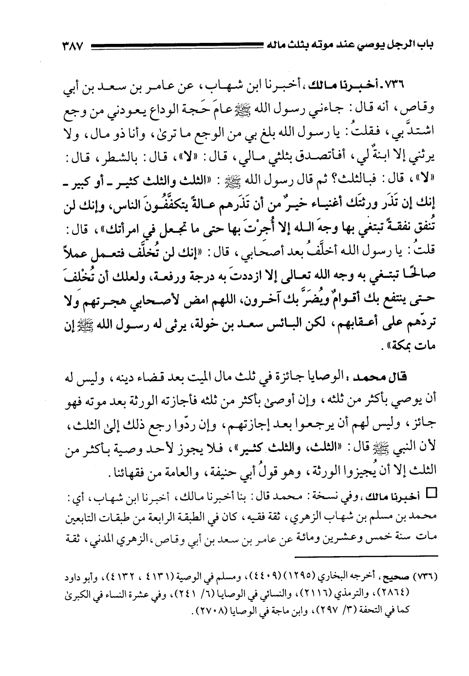 736 - أخبرنا مالك أخبرنا ابن شهاب، عن عامر بن سعد بن أبي وقاص، أنه قال: جاءني رسول الله - صلى الله عليه وسلم - عامَ حَجة الوداع يعودني من وجع اشتدَّ بي، فقلتُ: يا رسول الله بلغ بي من الوجع ما ترى، وأنا ذو مال، ولا يرثني إلا ابنةٌ لي، أفأتصدق بثلثي مالي، قال: "لا"، قال: بالشطر، قال: "لا"، قال: فبالثلث؟ ثم قال رسول الله - صلى الله عليه وسلم -: "الثلث والثلث كثير - أو كبير - إنك إن تَذَر ورثتَك أغنياء خيرٌ من أن تَذَرهم عالةً يتكفَّفُونَ الناس، وإنك لن تُنفق نفقةً تبتغي بها وجهَ الله إلا أُجِرْتَ بها حتى ما تجعل في امرأتك"، قال: قلتُ: يا رسول الله أخلَّفُ بعد أصحابي، قال: "إنك لن تُخلَّف فتعمل عملًا صالحًا تبتغي به وجه الله تعالى إلا ازددتَ به درجة ورفعة، ولعلك أن تُخْلِفَ حتى ينتفع بك أقوامٌ ويُضَرَّ بك آخرون، اللهم امض لأصحابي هجرتهم ولا تردّهم على أعقابهم، لكن البائس سعد بن خولة، يرثى له رسول الله - صلى الله عليه وسلم - إن مات بمكة".