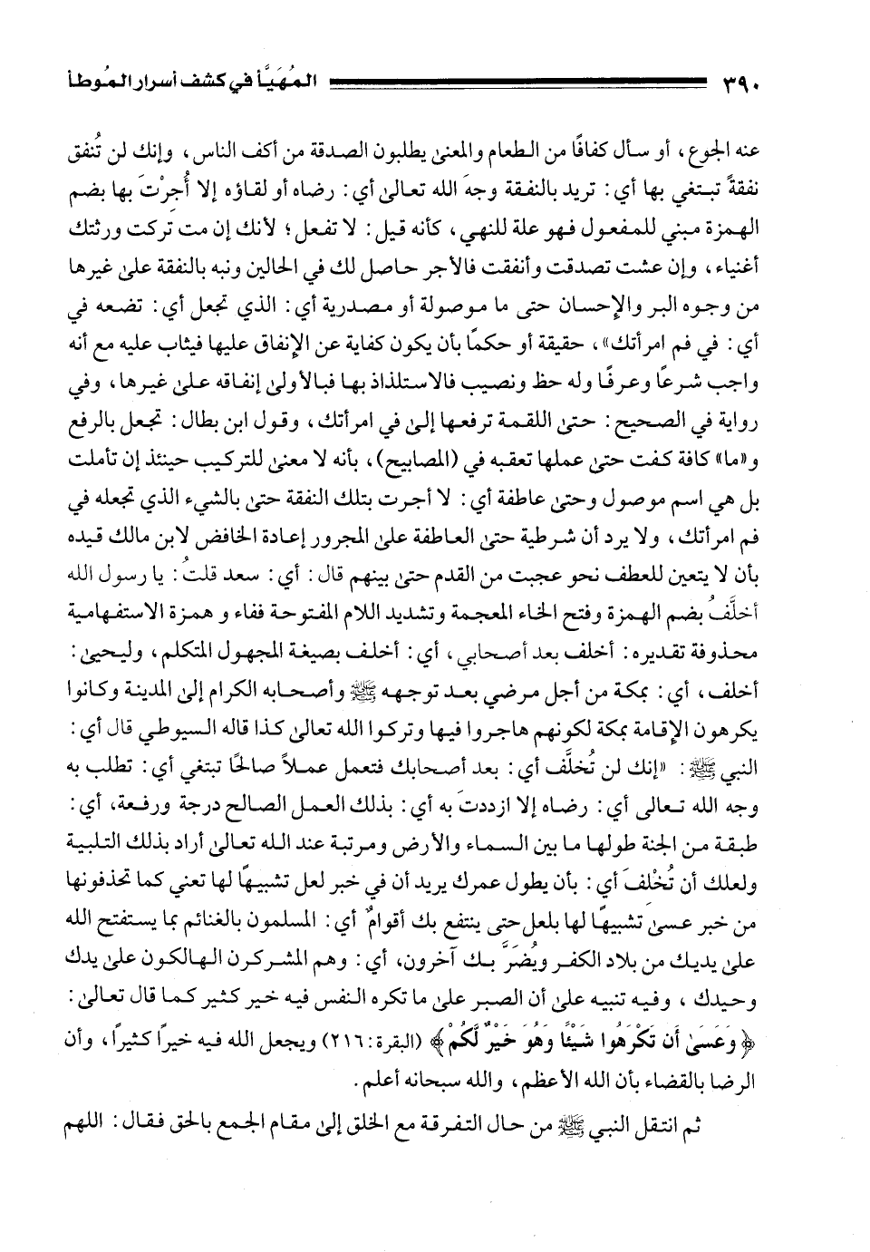 عنه الجوع، أو سأل كفافًا من الطعام والمعنى يطلبون الصدقة من أكف الناس، وإنك لن تُنفق نفقةً تبتغي بها أي: تريد بالنفقة وجهَ الله تعالى أي: رضاه أو لقاؤه إلا أُجِرْتَ بها بضم الهمزة مبني للمفعول فهو علة للنهي، كأنه قيل: لا تفعل؛ لأنك إن مت تركت ورثتك أغنياء، وإن عشت تصدقت وأنفقت فالأجر حاصل لك في الحالين ونبه بالنفقة على غيرها من وجوه البر والإِحسان حتى ما موصولة أو مصدرية أي: الذي تجعل أي: تضعه في أي: في فم امرأتك"، حقيقة أو حكمًا بأن يكون كفاية عن الإِنفاق عليها فيثاب عليه مع أنه واجب شرعًا وعرفًا وله حظ ونصيب فالاستلذاذ بها فبالأولى إنفاقه على غيرها، وفي رواية في الصحيح: حتى اللقمة ترفعها إلى في امرأتك، وقول ابن بطال: تجعل بالرفع و"ما" كافة كفت حتى عملها تعقبه في (المصابيح)، بأنه لا معنى للتركيب حينئذ إن تأملت بل هي اسم موصول وحتى عاطفة أي: لا أجرت بتلك النفقة حتى بالشيء الذي تجعله في فم امرأتك، ولا يرد أن شرطية حتى العاطفة على المجرور إعادة الخافض لابن مالك قيده بأن لا يتعين للعطف نحو عجبت من القدم حتى بينهم قال: أي: سعد قلتُ: يا رسول الله أخلَّفُ بضم الهمزة وفتح الخاء المعجمة وتشديد اللام المفتوحة ففاء وهمزة الاستفهامية محذوفة تقديره: أخلف بعد أصحابي، أي: أخلف بصيغة المجهول المتكلم، وليحيى: أخلف، أي: بمكة من أجل مرضي بعد توجهه - صلى الله عليه وسلم - وأصحابه الكرام إلى المدينة وكانوا يكرهون الإِقامة بمكة لكونهم هاجروا فيها وتركوا الله تعالى كذا قاله السيوطي قال أي: النبي - صلى الله عليه وسلم -: "إنك لن تُخلَّف أي: بعد أصحابك فتعمل عملًا صالحًا تبتغي أي: تطلب به وجه الله تعالى أي: رضاه إلا ازددتَ به أي: بذلك العمل الصالح درجة ورفعة، أي: طبقة من الجنة طولها ما بين السماء والأرض ومرتبة عند الله تعالى أراد بذلك التلبية ولعلك أن تُخْلِفَ أي: بأن يطول عمرك يريد أن في خبر لعل تشبيهًا لها تعني كما تحذفونها من خبر عسى تشبيهًا لها بلعل حتى ينتفع بك أقوامٌ أي: المسلمون بالغنائم بما يستفتح الله على يديك من بلاد الكفر ويُضَرَّ بك آخرون، أي: وهم المشركون الهالكون على يدك وحيدك، وفيه تنبيه على أن الصبر على ما تكره النفس فيه خير كثير كما قال تعالى: {وَعَسَى أَنْ تَكْرَهُوا شَيْئًا وَهُوَ خَيْرٌ لَكُمْ} [البقرة: 216] ويجعل الله فيه خيرًا كثيرًا، وأن الرضا بالقضاء بأن الله الأعظم، والله سبحانه أعلم.