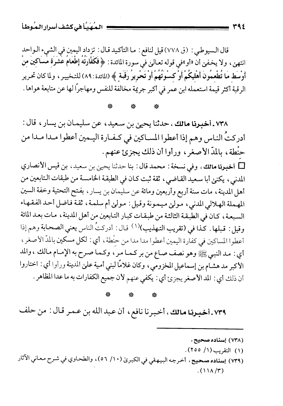 738 - أخبرنا مالك، حدثنا يحيى بن سعيد، عن سليمان بن يسار، قال: أدركتُ الناس وهم إذا أعطوا المساكين في كفارة اليمين أعطوا مدا مدا من حنْطة، بالمدّ الأصغر، ورأوا أن ذلك يجزئ عنهم.