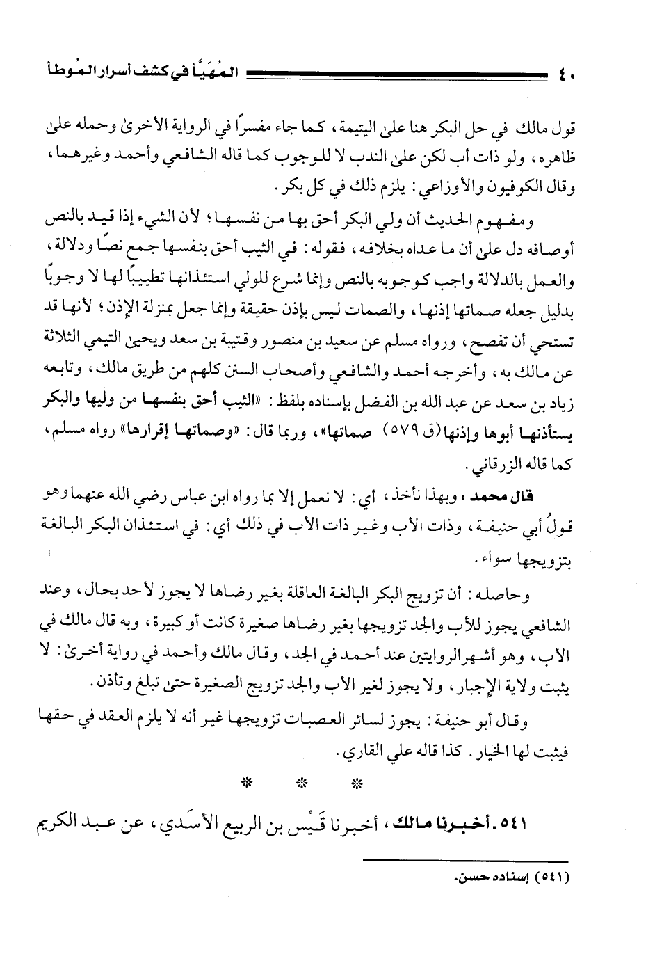 قال محمد: وبهذا نأخذ، أي: لا نعمل إلا بما رواه ابن عباس رضي الله عنهما وهو قولُ أبي حنيفة, وذات الأب وغير ذات الأب في ذلك أي: في استئذان البكر البالغة بتزويجها سواء.