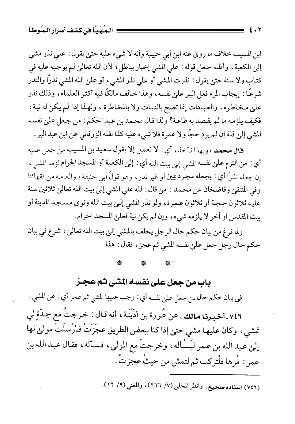746 - أخبرنا مالك، عن عُروة بن أذَيْنَة، أنه قال: خرجتُ مع جدّةٍ لي تمشي، وكان عليها مشي حتى إذا كنا ببعض الطريق عجَزَتْ فأرْسلَتْ مولى لها إلى عبد الله بن عمر ليَسْأله، وخرجتْ مع المولى، فسأله، فقال عبد الله بن عمر: مُرها فلْتركب ثم لتمش من حيثُ عجزتْ.