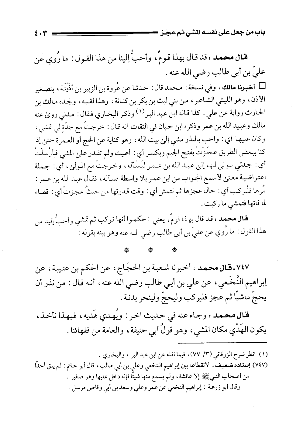 747 - قال محمد، أخبرنا شعبة بن الحجّاج، عن الحكم بن عتيبة، عن إبراهيم النَّخَعي، عن علي بن أبي طالب رضي الله عنه، أنه قال: من نذر أن يحجّ ماشيًا ثم عجز فليركب وليحجّ ولينحر بدنة.
