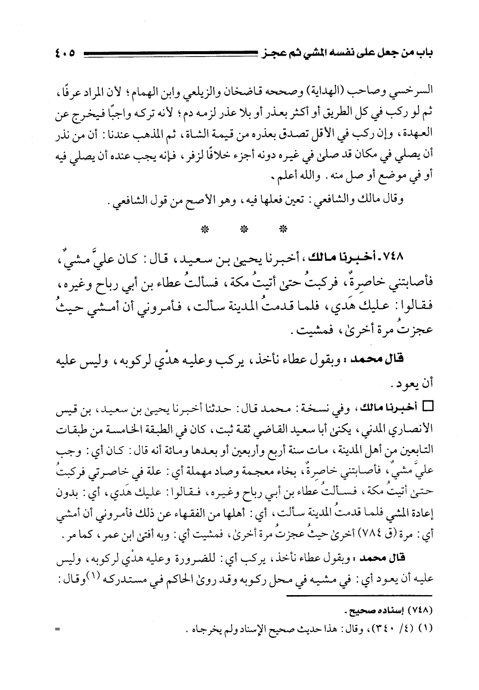 748 - أخبرنا مالك، أخبرنا يحيى بن سعيد، قال: كان عليَّ مشيٌ، فأصابتني خاصِرةٌ، فركبتُ حتى أتيتُ مكة، فسألتُ عطاء بن أبي رباح وغيره، فقالوا: عليك هَدي، فلما قدمتُ المدينة سألت، فأمروني أن أمشي حيثُ عجزتُ مرة أخرى، فمشيت.
