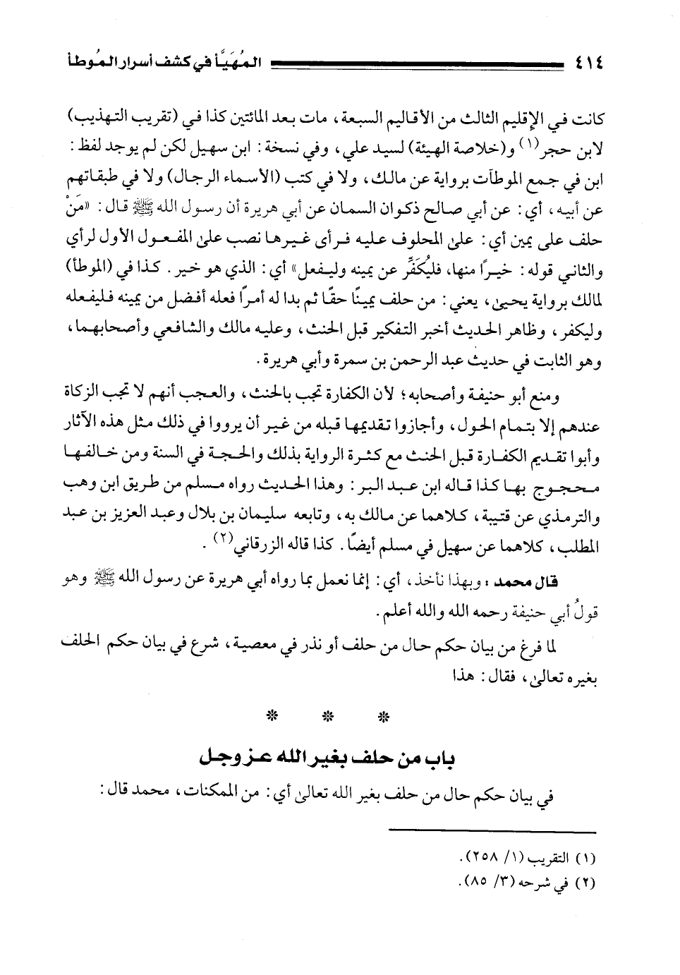 كانت في الإِقليم الثالث من الأقاليم السبعة، مات بعد المائتين كذا في (تقريب التهذيب) لابن حجر (¬1) و (خلاصة الهيئة) لسيد علي، وفي نسخة: ابن سهيل لكن لم يوجد لفظ: ابن في جمع الموطآت برواية عن مالك، ولا في كتب (الأسماء الرجال) ولا في طبقاتهم عن أبيه، أي: عن أبي صالح ذكوان السمان عن أبي هريرة أن رسول الله - صلى الله عليه وسلم - قال: "مَنْ حلف على يمين أي: على المحلوف عليه فرأى غيرها نصب على المفعول الأول لرأي والثاني قوله: خيرًا منها، فليُكَفِّر عن يمينه وليفعل" أي: الذي هو خير. كذا في (الموطأ) لمالك برواية يحيى، يعني: من حلف يمينًا حقًا ثم بدا له أمرًا فعله أفضل من يمينه فليفعله وليكفر، وظاهر الحديث أخبر التفكير قبل الحنث، وعليه مالك والشافعي وأصحابهما، وهو الثابت في حديث عبد الرحمن بن سمرة وأبي هريرة.