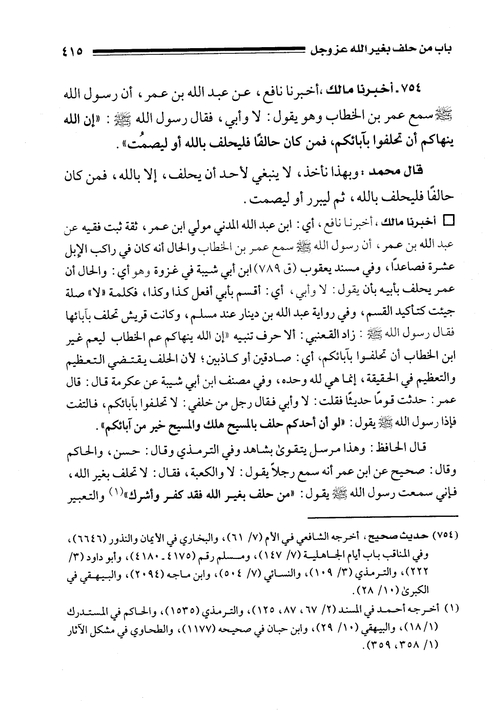 قال محمد: وبهذا نأخذ، لا ينبغي لأحد أن يحلف، إلا بالله، فمن كان حالفًا فليحلف بالله، ثم ليبرر أو ليصمت.