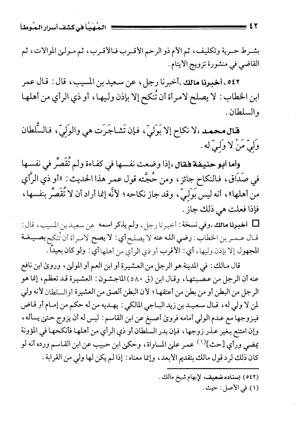 542 - أخبرنا مالك, أخبرنا رجل، عن سعيد بن المسيب، قال: قال عمر بن الخطاب: لا يصلح لامرأة أن تُنكح إلا بإذن وليها، أو ذي الرأي من أهلها والسلطان.
