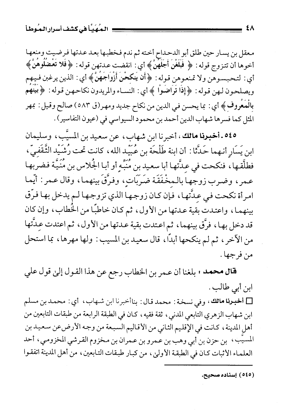 545 - أخبرنا مالك، أخرنا ابن شهاب، عن سعيد بن المسيَّب، وسليمان بن يَسَارٍ أنهما حَدَّثا: أن ابنة طَلْحَة بن عُبَيْد الله، كانت تحت رُشَيْد الثَّقَفِيّ، فطلَّقها، فنكحت في عِدَّتها أبا سعيد بن مُنَبِّهٍ أو أبا الجُلاس بن مُنَيَّة فضربها عمر، وضرب زوجها بالمِخْفَقَة ضَرَبَاتٍ، وفرَّقَ بينهما، وقال عمر: أيّما امرأة نكحت في عِدَّتها، فإن كان زوجها الذي تزوجها لم يدخل بها فرّق بينهما، واعتدت بقية عدتها من الأول، ثم كان خاطبًا من الخُطاب، وإن كان قد دخل بها، فرَّق بينهما، ثم اعتدت بقية عدتها من الأول، ثم اعتدت عِدَّتها من الآخر، ثم لم ينكحها أبدًا، قال سعيد بن المسيب: ولها مهرها، بما استحل من فرجها.