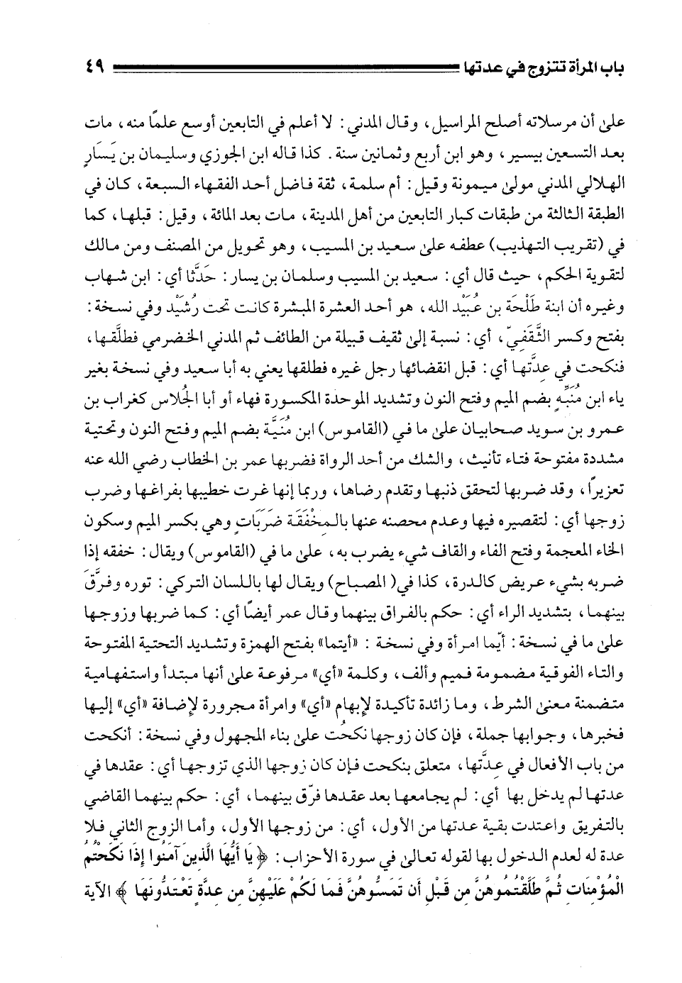 على أن مرسلاته أصلح المراسيل، وقال المدني: لا أعلم في التابعين أوسع علمًا منه، مات بعد التسعين بيسير، وهو ابن أربع وثمانين سنة. كذا قاله ابن الجوزي وسليمان بن يَسَارٍ الهلالي المدني مولى ميمونة وقيل: أم سلمة، ثقة فاضل أحد الفقهاء السبعة، كان في الطبقة الثالثة من طبقات كبار التابعين من أهل المدينة، مات بعد المائة، وقيل: قبلها، كما في (تقريب التهذيب) عطفه على سعيد بن المسيب، وهو تحويل من المصنف ومن مالك لتقوية الحكم، حيث قال أي: سعيد بن المسيب وسلمان بن يسار: حَدَّثا أي: ابن شهاب وغيره أن ابنة طَلْحَة بن عُبَيْد الله، هو أحد العشرة المبشرة كانت تحت رُشَيْد وفي نسخة: بفتح وكسر الثَّقَفِيّ، أي: نسبة إلى ثقيف قبيلة من الطائف ثم المدني الخضرمي فطلَّقها، فنكحت في عِدَّتها أي: قبل انقضائها رجل غيره فطلقها يعني به أبا سعيد وفي نسخة بغير ياء ابن مُنَبِّهٍ بضم الميم وفتح النون وتشديد الموحدة المكسورة فهاء أو أبا الجُلاس كغراب بن عمرو بن سويد صحابيان على ما في (القاموس) ابن مُنَيَّة بضم الميم وفتح النون وتحتية مشددة مفتوحة فتاء تأنيث، والشك من أحد الرواة فضربها عمر بن الخطاب رضي الله عنه تعزيرًا، وقد ضربها لتحقق ذنبها وتقدم رضاها، وربما إنها غرت خطيبها بفراغها وضرب زوجها أي: لتقصيره فيها وعدم محصنه عنها بالمِخْفَقَة ضَرَبَاتٍ وهي بكسر الميم وسكون الخاء المعجمة وفتح الفاء والقاف شيء يضرب به، على ما في (القاموس) ويقال: خفقه إذا ضربه بشيء عريض كالدرة، كذا في (المصباح) ويقال لها باللسان التركي: توره وفرَّقَ بينهما، بتشديد الراء أي: حكم بالفراق بينهما وقال عمر أيضًا أي: كما ضربها وزوجها على ما في نسخة: أيّما امرأة وفي نسخة: "أيتما" بفتح الهمزة وتشديد التحتية المفتوحة والتاء الفوقية مضمومة فميم وألف، وكلمة "أي" مرفوعة على أنها مبتدأ واستفهامية متضمنة معنى الشرط، وما زائدة تأكيدة لإِبهام "أي" وامرأة مجرورة لإِضافة "أي" إليها فخبرها، وجوابها جملة، فإن كان زوجها نكحت على بناء المجهول وفي نسخة: أنكحت من باب الأفعال في عِدَّتها، متعلق بنكحت فإن كان زوجها الذي تزوجها أي: عقدها في عدتها لم يدخل بها أي: لم يجامعها بعد عقدها فرّق بينهما، أي: حكم بينهما القاضي بالتفريق واعتدت بقية عدتها من الأول، أي: من زوجها الأول، وأما الزوج الثاني فلا عدة له لعدم الدخول بها لقوله تعالى في سورة الأحزاب: {يَاأَيُّهَا الَّذِينَ آمَنُوا إِذَا نَكَحْتُمُ الْمُؤْمِنَاتِ ثُمَّ طَلَّقْتُمُوهُنَّ مِنْ قَبْلِ أَنْ تَمَسُّوهُنَّ فَمَا لَكُمْ عَلَيْهِنَّ مِنْ عِدَّةٍ تَعْتَدُّونَهَا} الآية