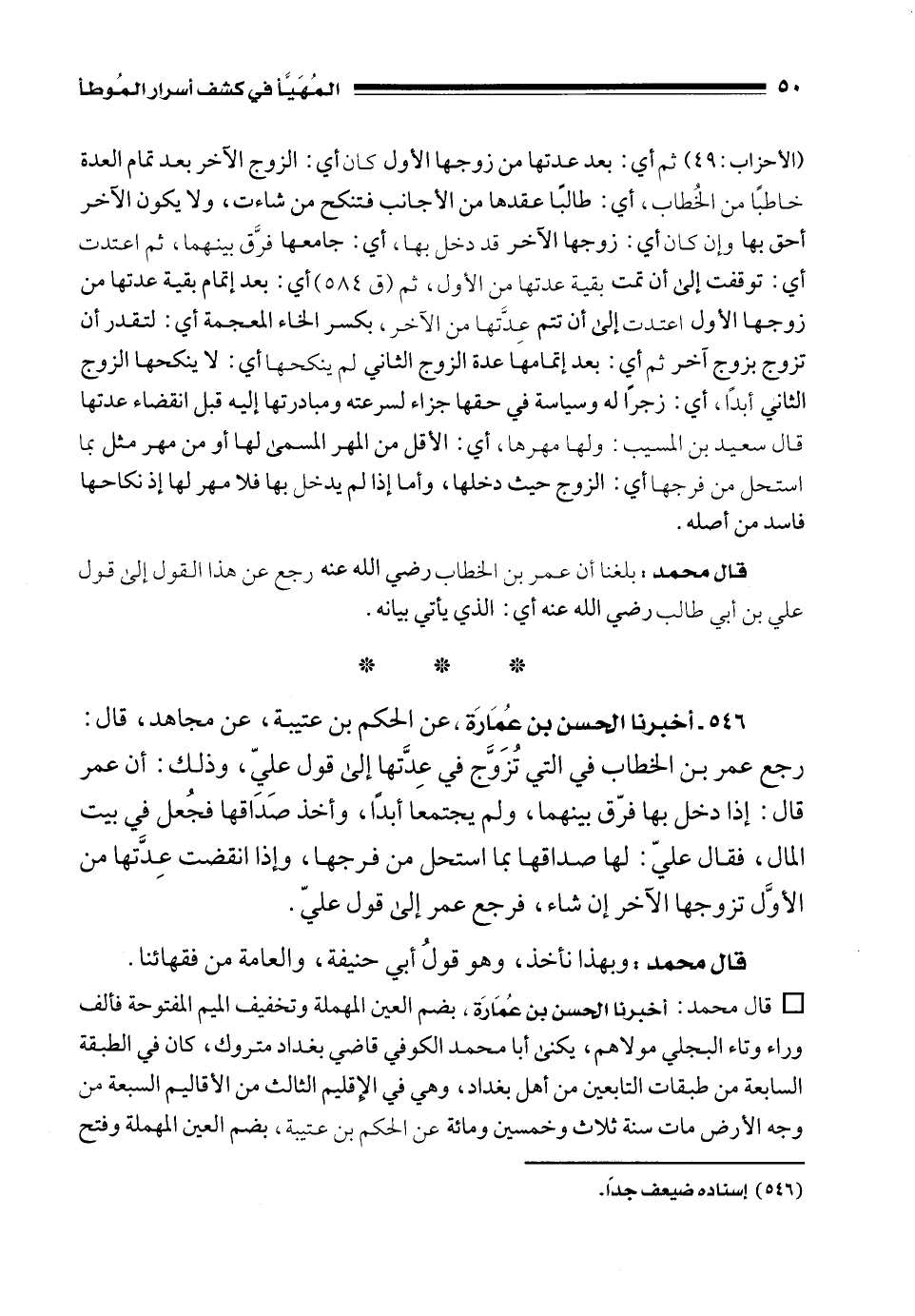 546 - أخبرنا الحسن بن عُمَارَة, عن الحكم بن عتيبة، عن مجاهد، قال: رجع عمر بن الخطاب في التي تُزَوَّج في عِدَّتها إلى قول عليّ، وذلك: أن عمر قال: إذا دخل بها فرّق بينهما, ولم يجتمعا أبدًا، وأخذ صَدَاقها فجُعل في بيت المال، فقال عليّ: لها صداقها بما استحل من فرجها، وإذا انقضت عِدَّتها من الأوَّل تزوجها الآخر إن شاء، فرجع عمر إلى قول عليّ.