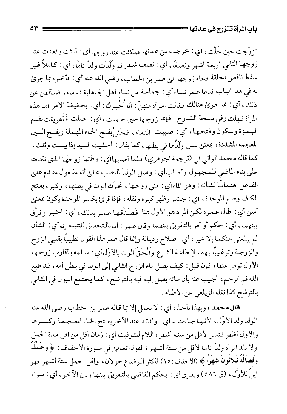 قال محمد: وبهذا نأخذ، أي: لا نعمل إلا بما قاله عمر بن الخطاب رضي الله عنه الولد ولد الأوّل, لأنها جاءت به أي: ولدته عند الآخر بفتح الخاء المعجمة وكسرها والأول أظهر فتدبر لأقل من ستة أشهر، اللام للتوقيت أي: زمان أقل من أقل مدة الحمل ولا تلد المرأة ولدًا تاما لأقل من ستة أشهر؛ لقوله تعالى في سورة الأحقاف: {وَحَمْلُهُ وَفِصَالُهُ ثَلَاثُونَ شَهْرًا} [الأحقاف: 15] فأكثر الرضاع حولان، وأقل الحمل ستة أشهر فهو ابنٌ للأوَّل، (ق 586) ويفرق أي: يحكم القاضي بالتفريق بينها وبين الآخر، أي: سواء