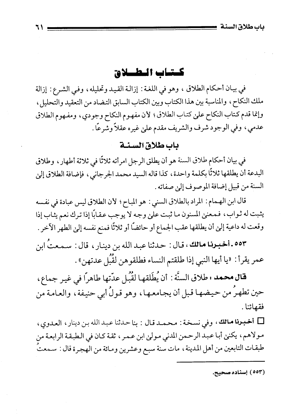 في بيان أحكام طلاق السنة هو أن يطلق الرجل امرأته ثلاثًا في ثلاثة أطهار، وطلاق البدعة أن يطلقها ثلاثًا بكلمة واحدة، كذا قاله السيد محمد الجرجاني، فإضافة الطلاق إلى السنة من قبيل إضافة الموصوف إلى صفاته.