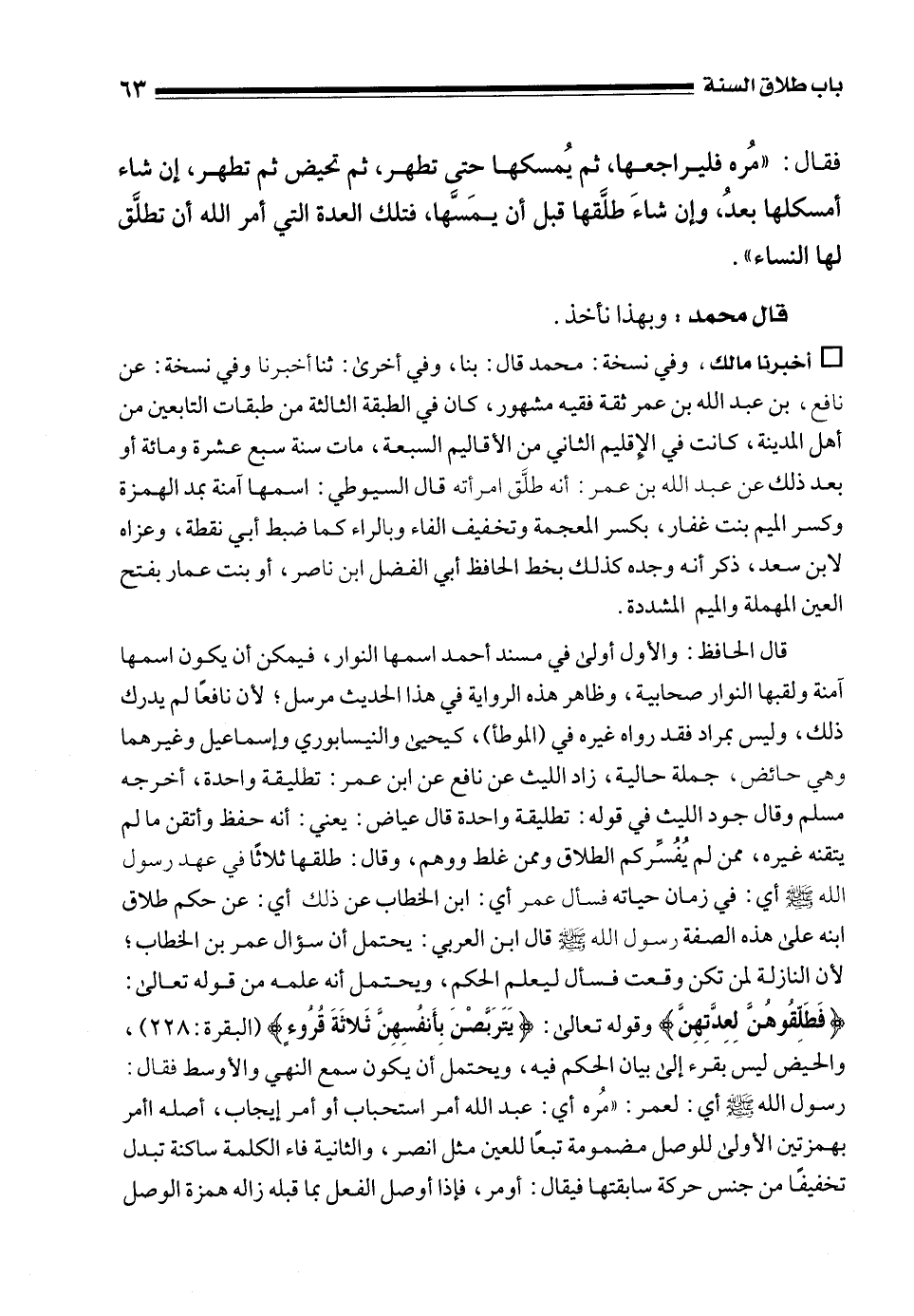 • أخبرنا مالك، وفي نسخة: محمد قال: بنا، وفي أخرى: ثنا أخبرنا وفي نسخة: عن نافع، بن عبد الله بن عمر ثقة فقيه مشهور، كان في الطبقة الثالثة من طبقات التابعين من أهل المدينة، كانت في الإِقليم الثاني من الأقاليم السبعة، مات سنة سبع عشرة ومائة أو بعد ذلك عن عبد الله بن عمر: أنه طلَّق امرأته قال السيوطي: اسمها آمنة بمد الهمزة وكسر الميم بنت غفار، بكسر المعجمة وتخفيف الفاء وبالراء كما ضبط أبي نقطة، وعزاه لابن سعد، ذكر أنه وجده كذلك بخط الحافظ أبي الفضل ابن ناصر، أو بنت عمار بفتح العين المهملة والميم المشددة.