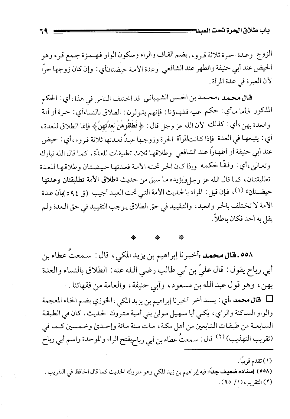 558 - قال محمد: أخبرنا إبراهيم بن يزيد المكي، قال: سمعتُ عطاء بن أبي رباح يقول: قال عليّ بن أبي طالب رضي الله عنه: الطلاق بالنساء والعدة بهن، وهو قول عبد الله بن مسعود، وأبي حنيفة، والعامة من فقهائنا.
