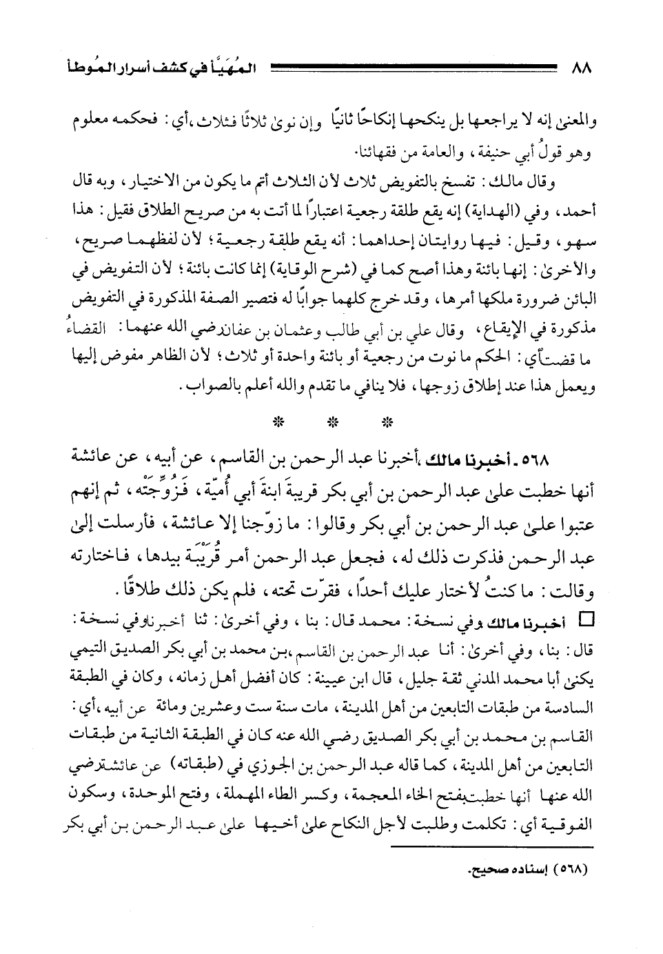 568 - أخبرنا مالك، أخبرنا عبد الرحمن بن القاسم، عن أبيه، عن عائشة أنها خطبت على عبد الرحمن بن أبي بكر قريبةَ ابنةَ أبي أُميّة، فَزُوِّجَتْه، ثم إنهم عتبوا على عبد الرحمن بن أبي بكر وقالوا: ما زوّجنا إلا عائشة، فأرسلت إلى عبد الرحمن فذكرت ذلك له، فجعل عبد الرحمن أمر قُرَيْبَة بيدها، فاختارته وقالت: ما كنتُ لأختار عليك أحدًا، فقرّت تحته، فلم يكن ذلك طلاقًا.