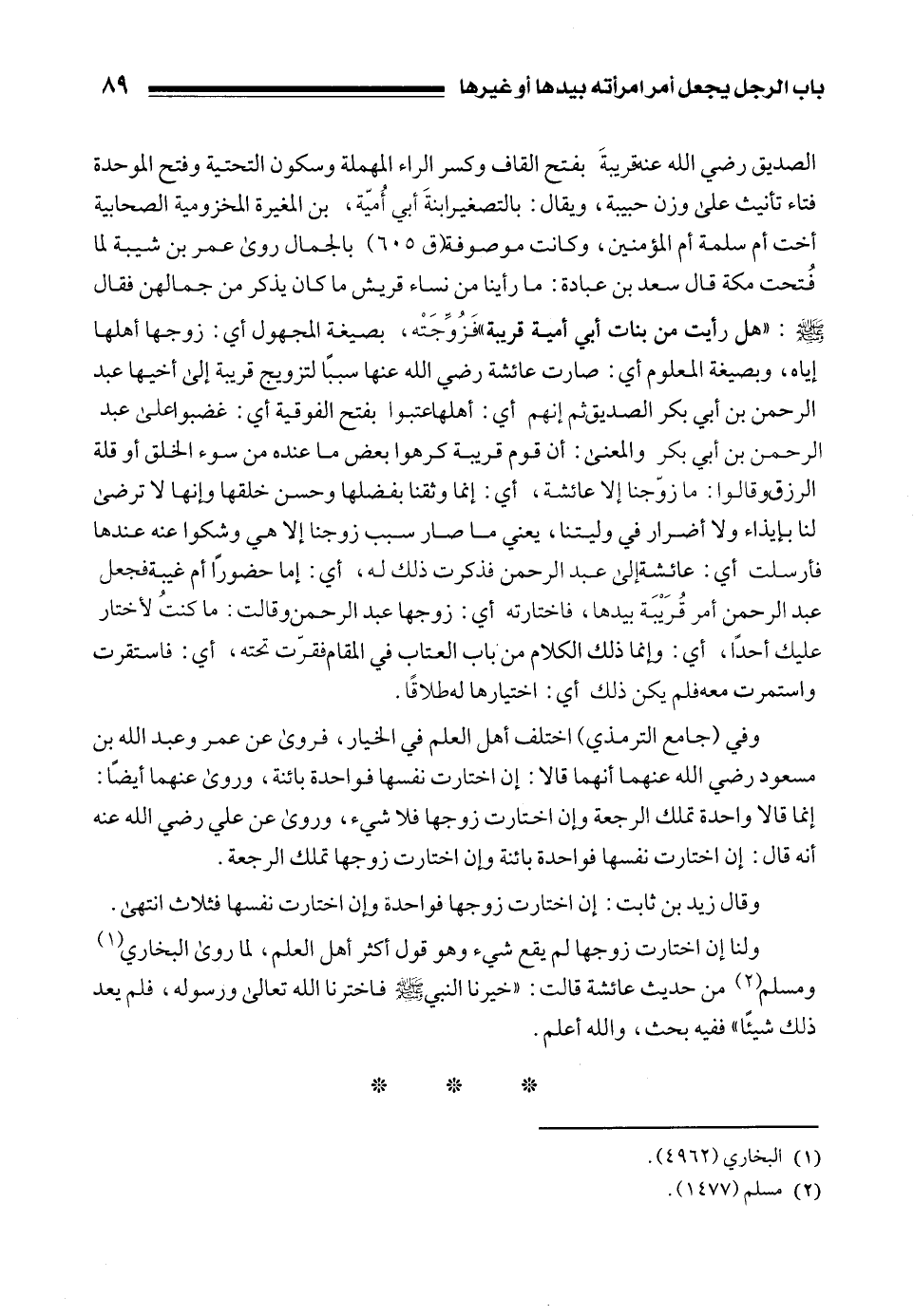 الصديق رضي الله عنه قريبةَ بفتح القاف وكسر الراء المهملة وسكون التحتية وفتح الموحدة فتاء تأنيث على وزن حبيبة، ويقال: بالتصغير ابنةَ أبي أُميّة، بن المغيرة المخزومية الصحابية أخت أم سلمة أم المؤمنين، وكانت موصوفة (ق 605) بالجمال روى عمر بن شيبة لما فُتحت مكة قال سعد بن عبادة: ما رأينا من نساء قريش ما كان يذكر من جمالهن فقال - صلى الله عليه وسلم -: "هل رأيت من بنات أبي أمية قريبة" فَزُوِّجَتْه، بصيغة المجهول أي: زوجها أهلها إياه، وبصيغة المعلوم أي: صارت عائشة رضي الله عنها سببًا لتزويج قريبة إلى أخيها عبد الرحمن بن أبي بكر الصديق ثم إنهم أي: أهلها عتبوا بفتح الفوقية أي: غضبوا على عبد الرحمن بن أبي بكر والمعنى: أن قوم قريبة كرهوا بعض ما عنده من سوء الخلق أو قلة الرزق وقالوا: ما زوّجنا إلا عائشة، أي: إنما وثقنا بفضلها وحسن خلقها وإنها لا ترضى لنا بإيذاء ولا أضرار في وليتنا، يعني ما صار سبب زوجنا إلا هي وشكوا عنه عندها فأرسلت أي: عائشة إلى عبد الرحمن فذكرت ذلك له، أي: إما حضورًا أم غيبة فجعل عبد الرحمن أمر قُرَيْبَة بيدها، فاختارته أي: زوجها عبد الرحمن وقالت: ما كنتُ لأختار عليك أحدًا، أي: وإنما ذلك الكلام من باب العتاب في المقام فقرّت تحته، أي: فاستقرت واستمرت معه فلم يكن ذلك أي: اختيارها له طلاقًا.