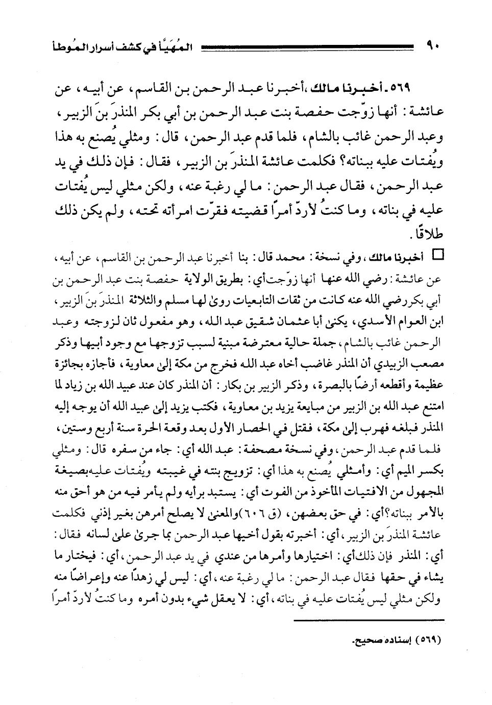 569 - أخبرنا مالك، أخبرنا عبد الرحمن بن القاسم، عن أبيه، عن عائشة: أنها زوّجت حفصة بنت عبد الرحمن بن أبي بكر المنذرَ بنَ الزبير، وعبد الرحمن غائب بالشام، فلما قدم عبد الرحمن، قال: ومثلي يُصنع به هذا ويُفتات عليه ببناته؟ فكلمت عائشة المنذرَ بن الزبير، فقال: فإن ذلك في يد عبد الرحمن، فقال عبد الرحمن: ما لي رغبة عنه، ولكن مثلي ليس يُفتات عليه في بناته، وما كنتُ لأردّ أمرًا قضيته فقرّت امرأته تحته، ولم يكن ذلك طلاقًا.