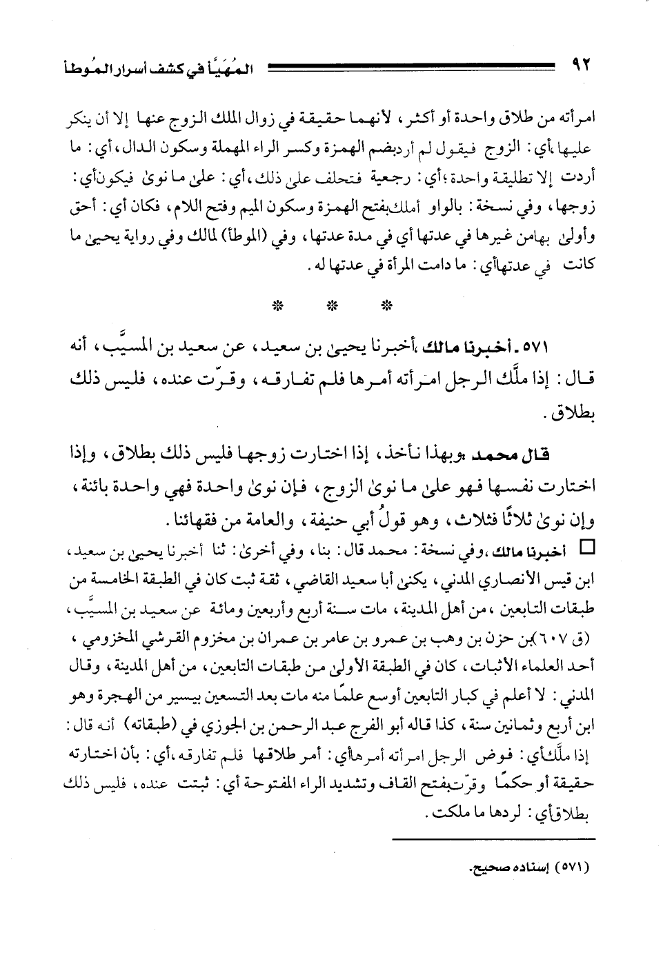 • أخبرنا مالك، وفي نسخة: محمد قال: بنا، وفي أخرى: ثنا أخبرنا يحيى بن سعيد، بن قيس الأنصاري المدني، يكنى أبا سعيد القاضي، ثقة ثبت كان في الطبقة الخامسة من طبقات التابعين، من أهل المدينة، مات سنة أربع وأربعين ومائة عن سعيد بن المسيَّب، (ق 607) بن حزن بن وهب بن عمرو بن عامر بن عمران بن مخزوم القرشي المخزومي، أحد العلماء الأثبات، كان في الطبقة الأولى من طبقات التابعين، من أهل المدينة، وقال المدني: لا أعلم في كبار التابعين أوسع علمًا منه مات بعد التسعين بيسير من الهجرة وهو ابن أربع وثمانين سنة، كذا قاله أبو الفرج عبد الرحمن بن الجوزي في (طبقاته) أنه قال: إذا ملَّك أي: فوض الرجل امرأته أمرها أي: أمر طلاقها فلم تفارقه، أي: بأن اختارته حقيقة أو حكمًا وقرّت بفتح القاف وتشديد الراء المفتوحة أي: ثبتت عنده، فليس ذلك بطلاق أي: لردها ما ملكت.