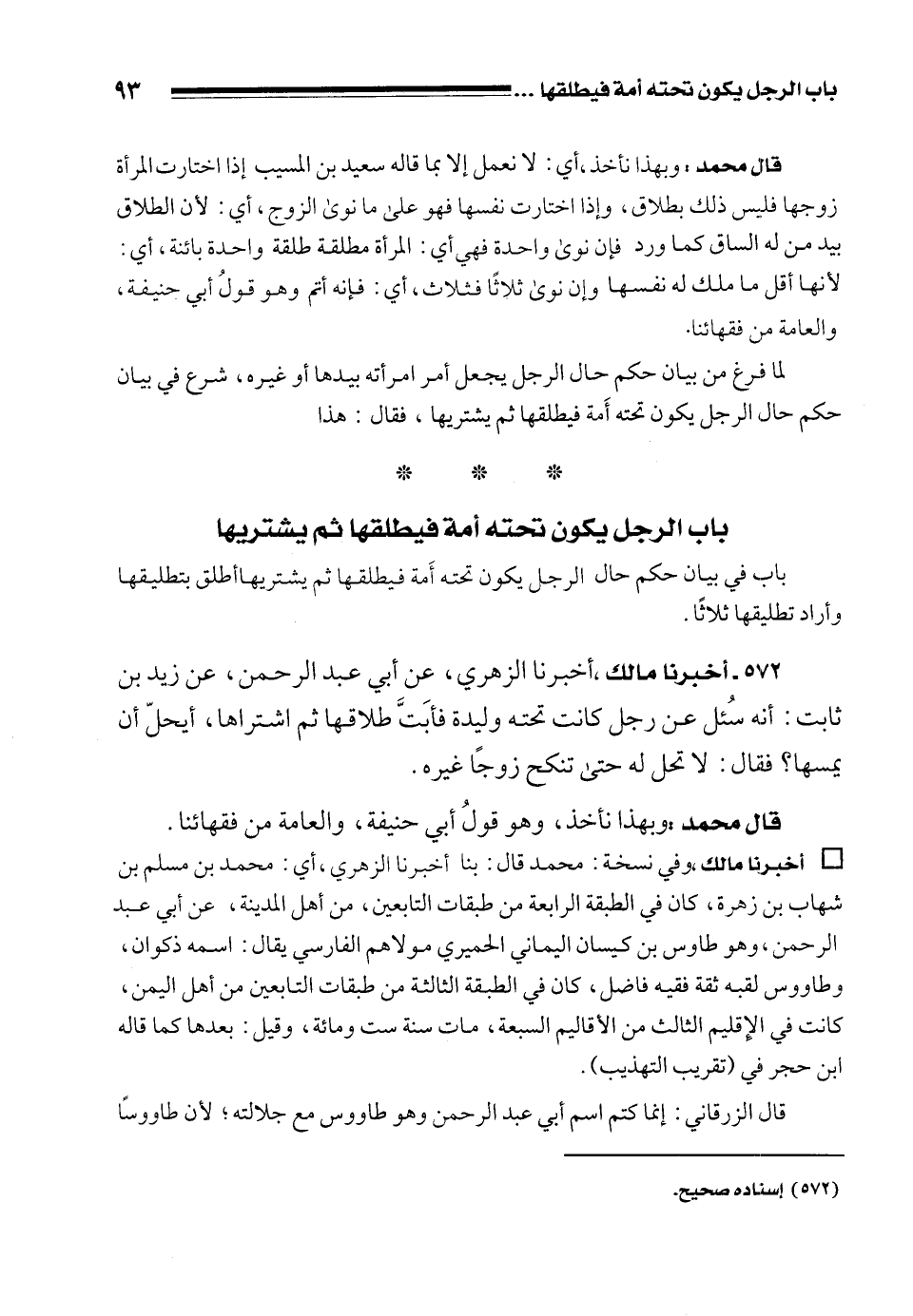 572 - أخبرنا مالك، أخبرنا الزهري، عن أبي عبد الرحمن، عن زيد بن ثابت: أنه سُئل عن رجل كانت تحته وليدة فأبَتَّ طلاقها ثم اشتراها، أيحلّ أن يمسها؟ فقال: لا تحل له حتى تنكح زوجًا غيره.
